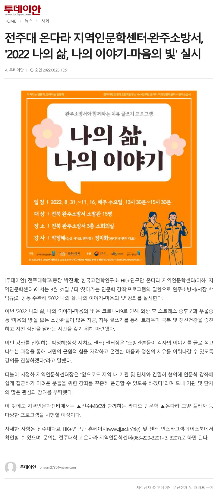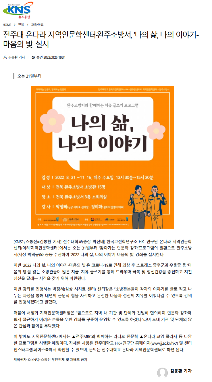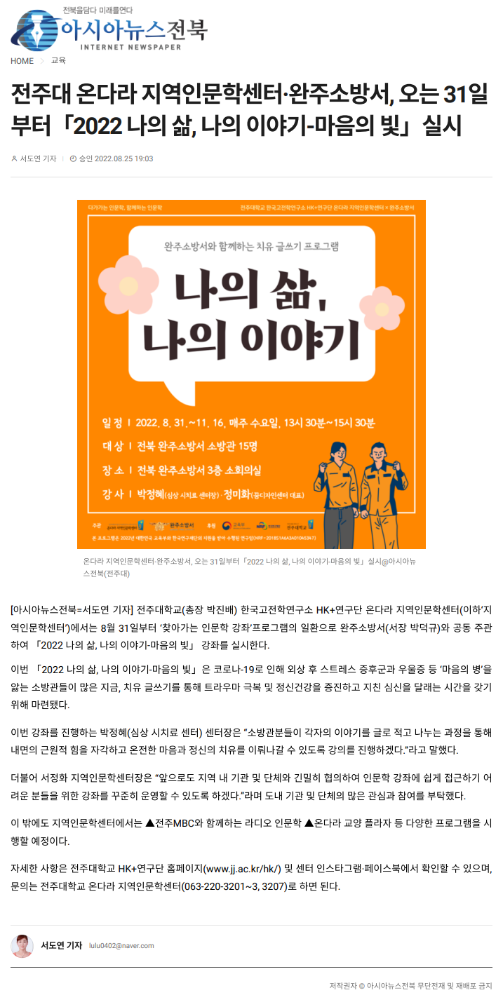 전주대 온다라 지역인문학센터·완주소방서, 오는 31일부터 「2022 나의 삶, 나의 이야기-마음의 빛」 실시