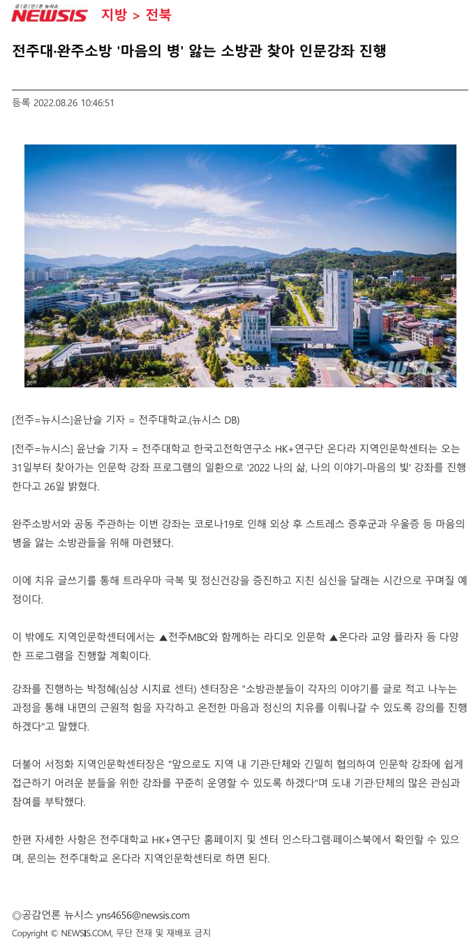 | 604 | 기타 | 전주대·완주소방 '마음의 병' 앓는 소방관 찾아 인문강좌 진행 | 온다라 지역인문학센터 | 22-09-07 | 215 |