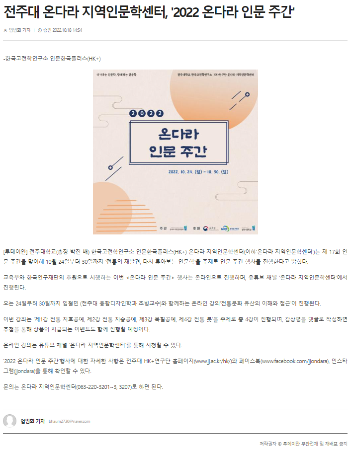 전주대 온다라 지역인문학센터, '2022 온다라 인문 주간'