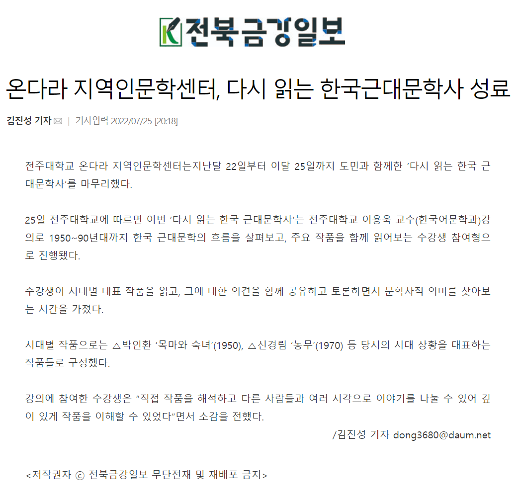 온다라 지역인문학센터, 다시 읽는 한국근대문학사 성료