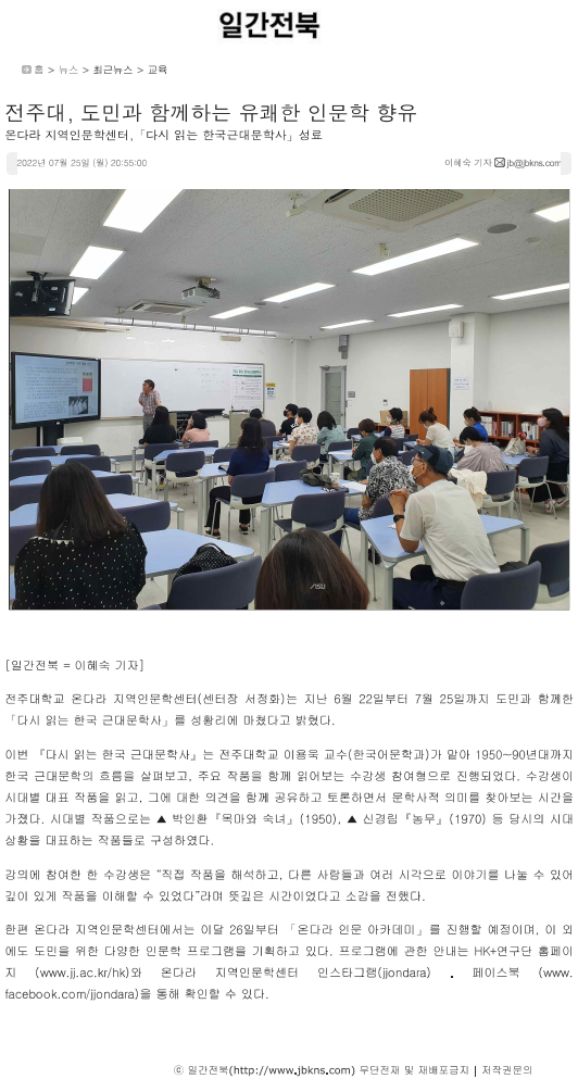 | 591 | 기타 | 전주대, 도민과 함께하는 유쾌한 인문학 향유 '다시 읽는 한국근대문학사' 성료 | 온다라 지역인문학센터 | 22-08-17 | 194 |