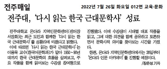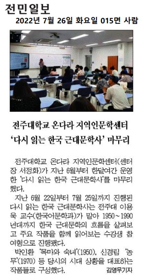 | 592 | 기타 | 전주대학교 온다라 지역인문학센터 '다시 읽는 한국 근대문학사' 마무리 | 온다라 지역인문학센터 | 22-08-17 | 209 |