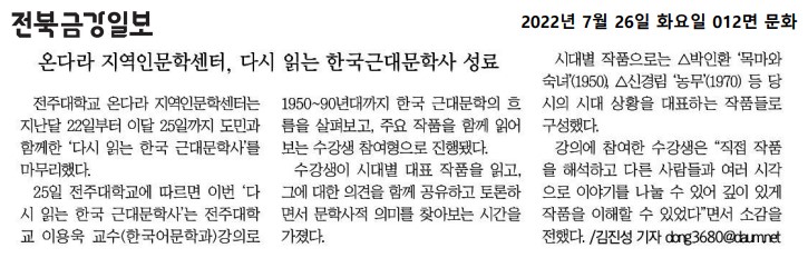 | 594 | 기타 | 온다라 지역인문학센터, 다시 읽는 한국근대문학사 성료 | 온다라 지역인문학센터 | 22-08-17 | 229 |