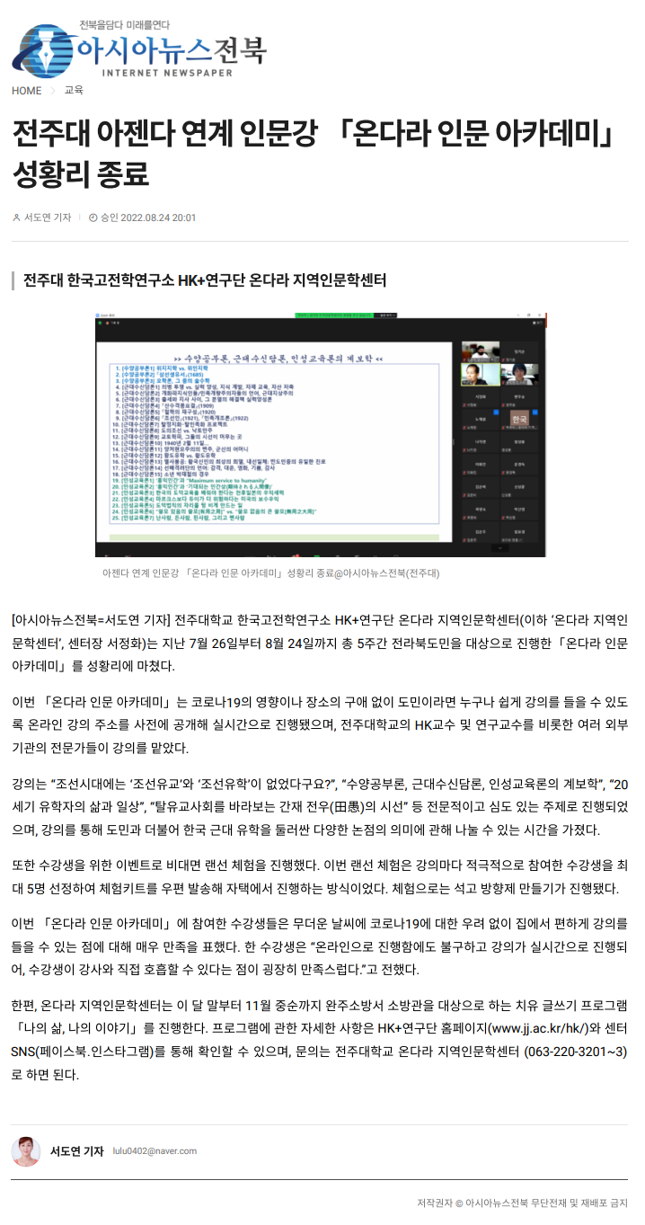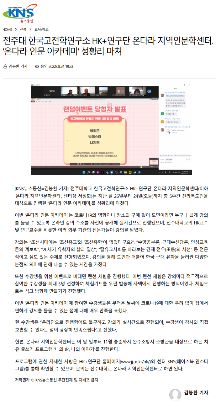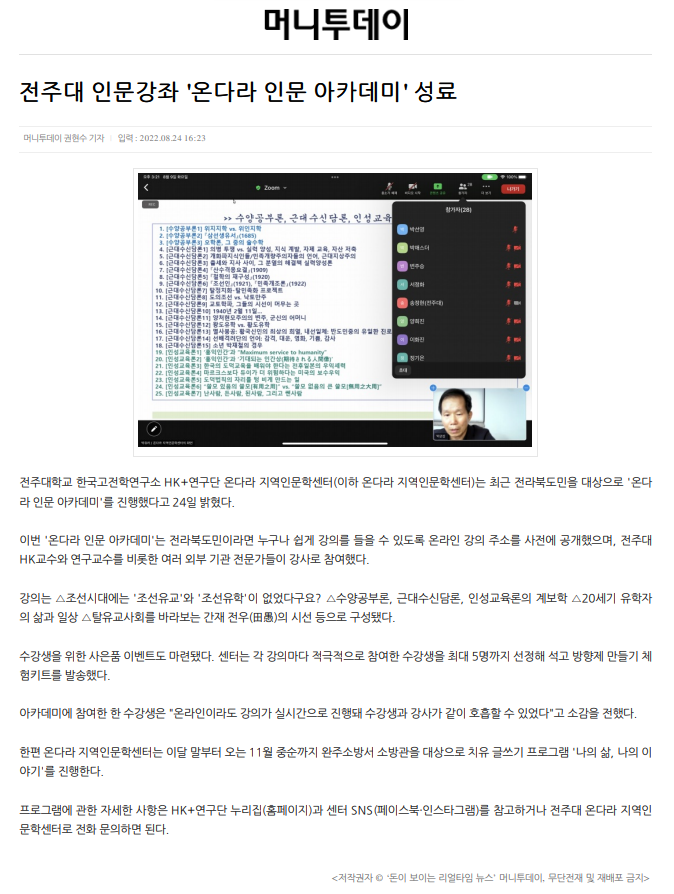 | 598 | 기타 | 전주대 한국고전학연구소 HK+연구단 온다라 지역인문학센터, '온다라 인문 아카데미' 성황리 마쳐 | 온다라 지역인문학센터 | 22-09-07 | 213 |