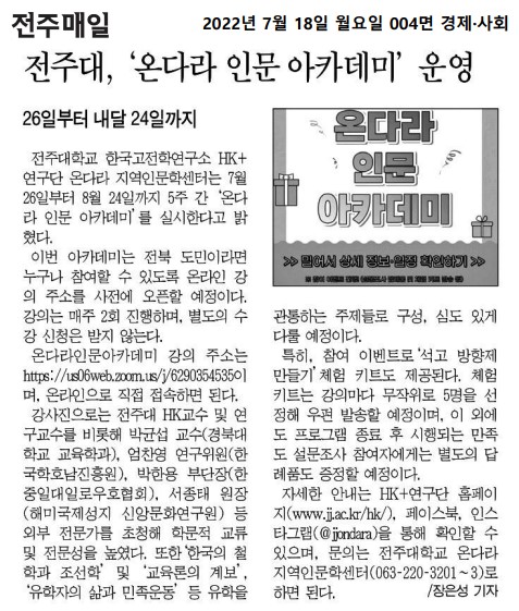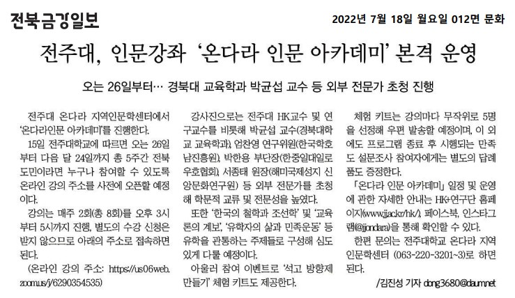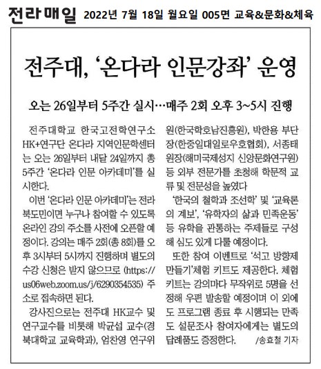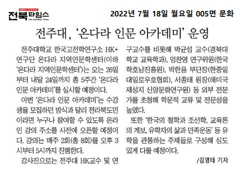 | 582 | 기타 | 전주대, 인문강좌 '온다라 인문 아카데미' 본격 운영 | 온다라 지역인문학센터 | 22-08-17 | 196 |