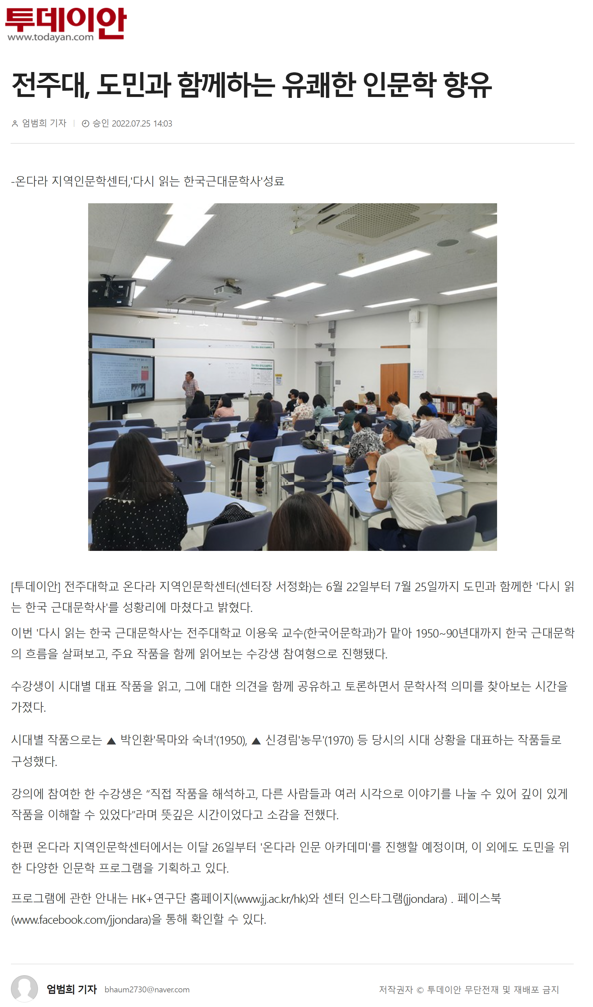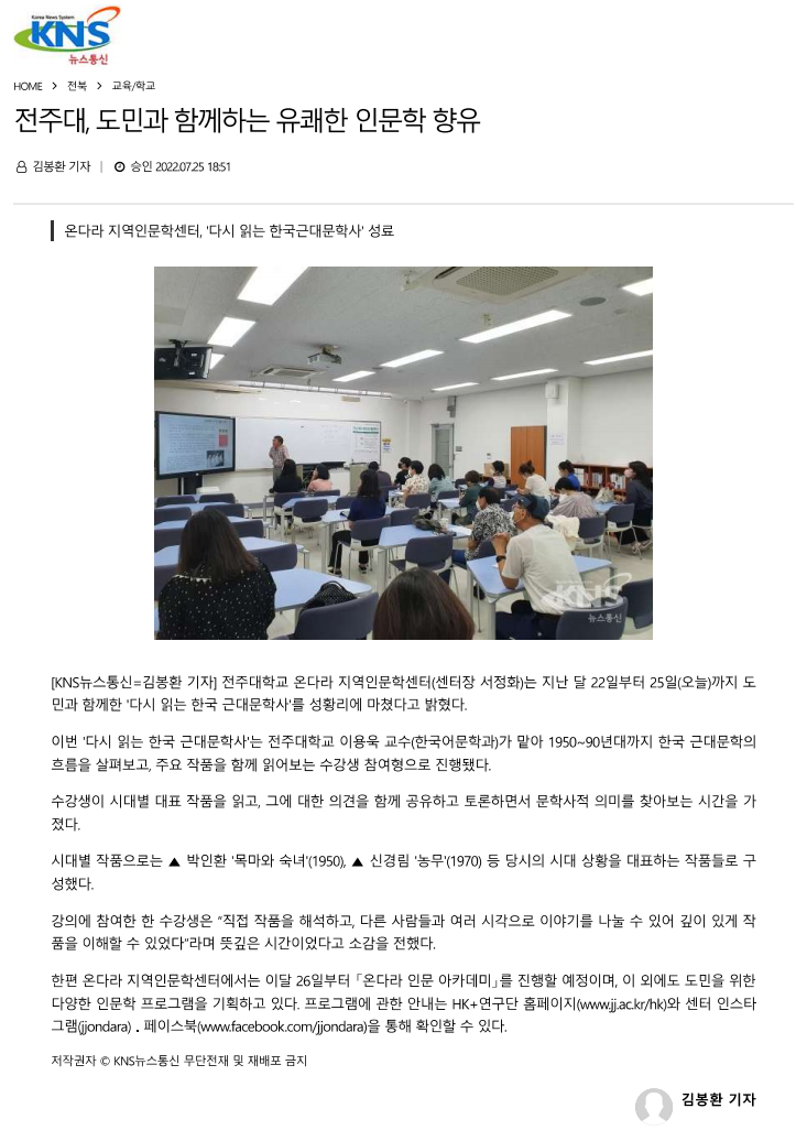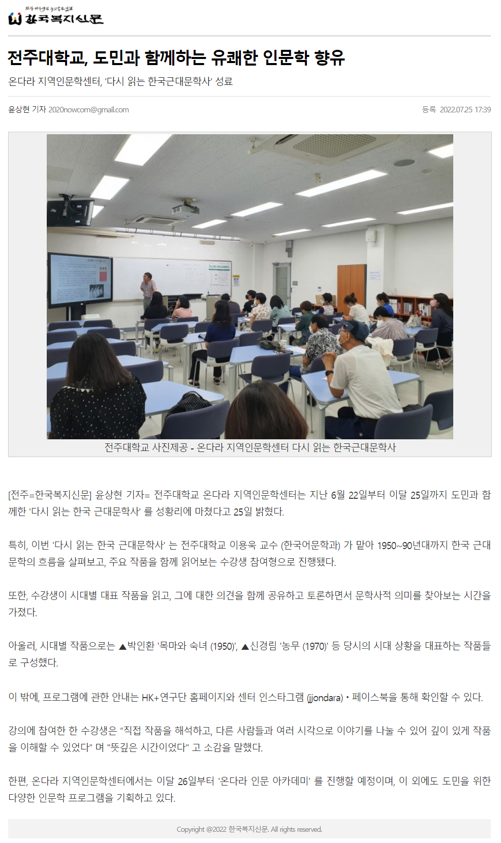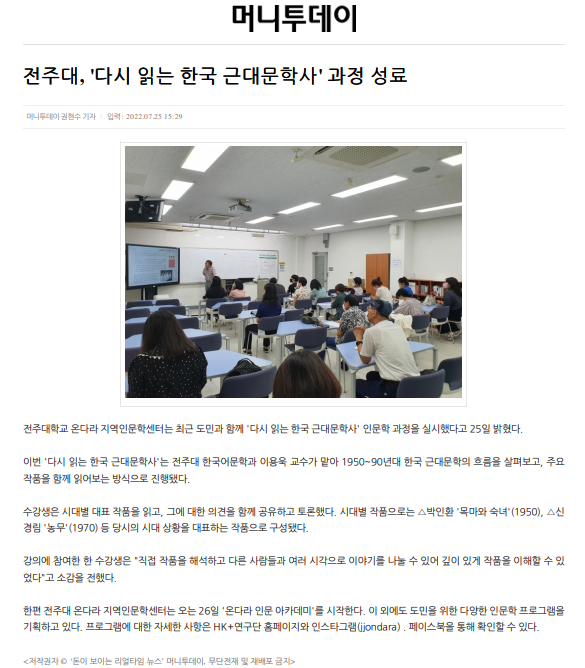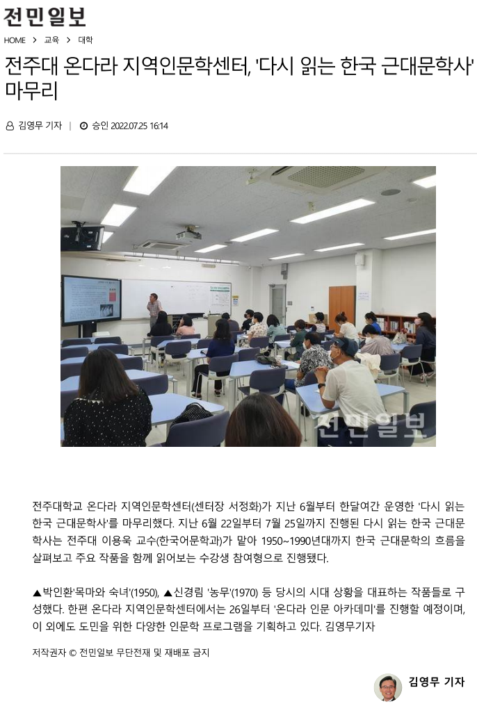 | 585 | 기타 | 전주대 온다라 지역인문학센터, '다시 읽는 한국 근대문학사' 마무리 | 온다라 지역인문학센터 | 22-08-17 | 215 |