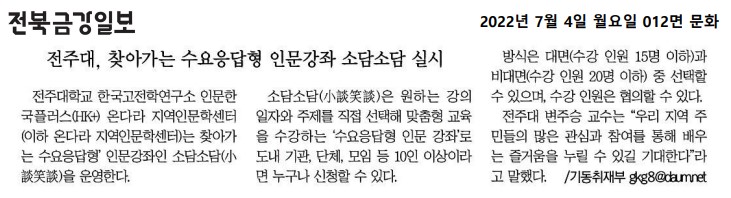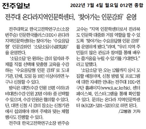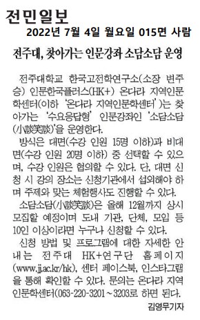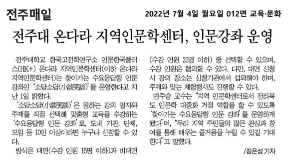 | 576 | 기타 | 전주대, 찾아가는 수요응답형 인문강좌 소담소담 실시 | 온다라 지역인문학센터 | 22-08-17 | 194 |