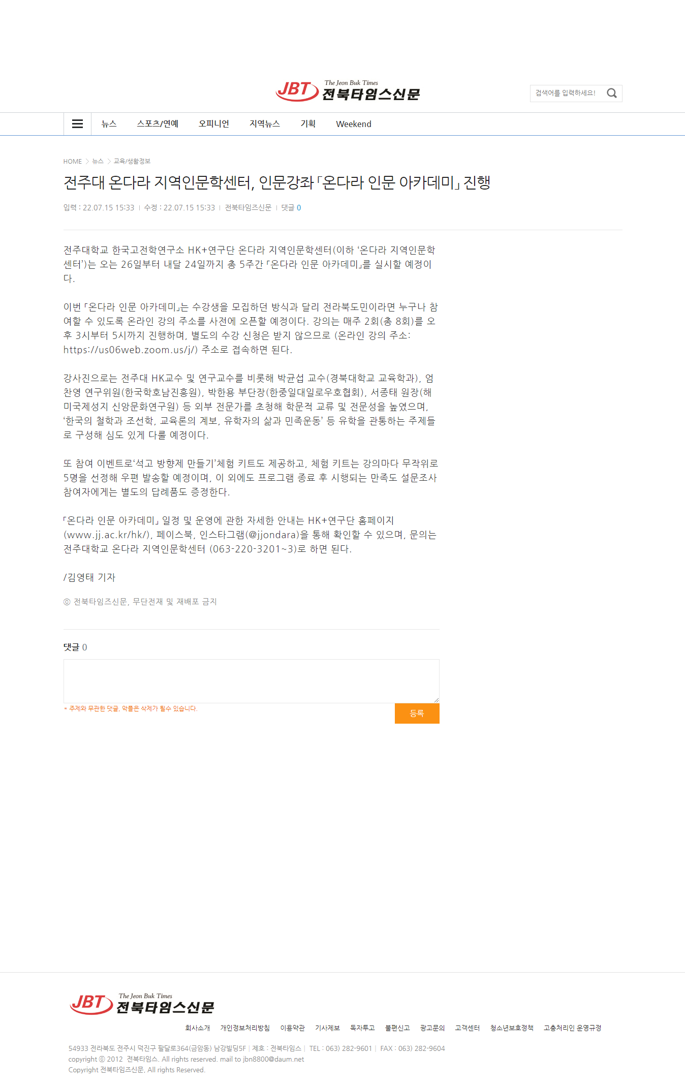 | 561 | 기타 | 전주대 온다라 지역인문학센터, 인문강좌「온다라 인문 아카데미」진행 | 온다라 지역인문학센터 | 22-07-19 | 196 |