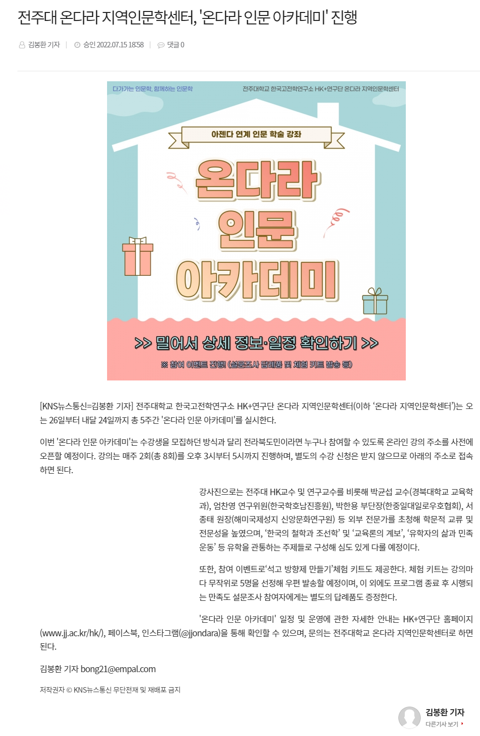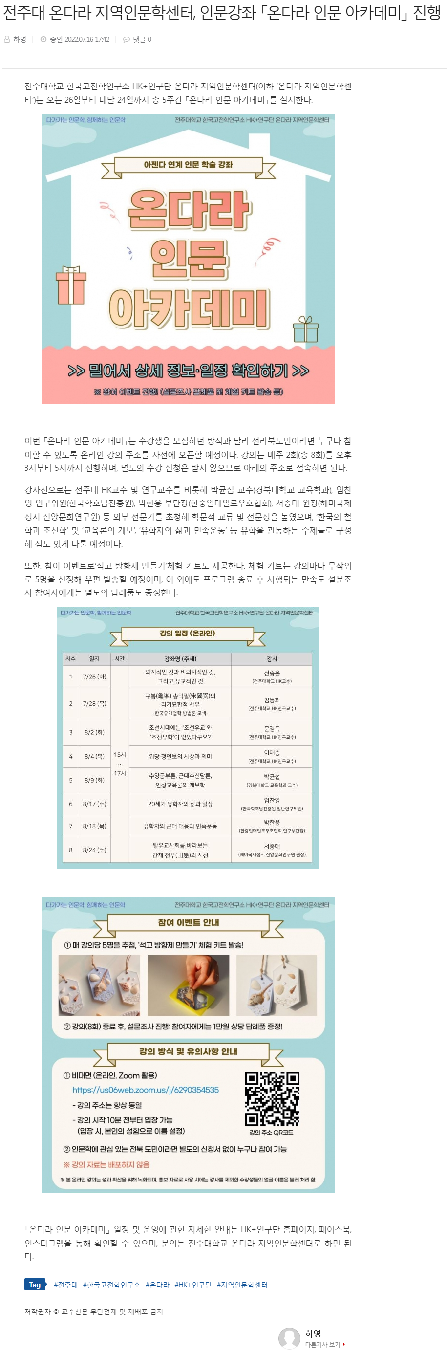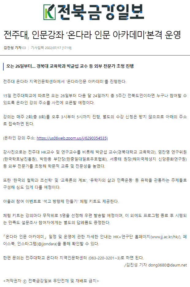 | 562 | 기타 | 전주대학교, '온다라 지역인문학센터' 인문강좌 '온다라 인문 아카데미' 진행 | 온다라 지역인문학센터 | 22-07-19 | 209 |