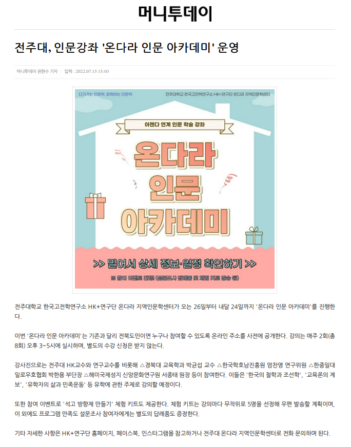 | 564 | 기타 | 전주대 온다라 지역인문학센터, 인문강좌 「온다라 인문 아카데미」 진행 | 온다라 지역인문학센터 | 22-07-19 | 197 |