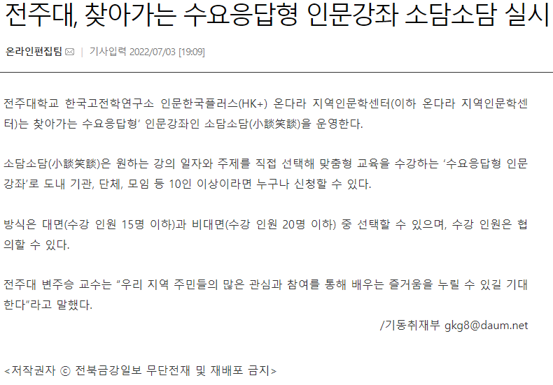 | 550 | 기타 | 전주대, '찾아가는 수요응답형 인문강좌' ‘소담소담(小談笑談)’ 실시 | 온다라 지역인문학센터 | 22-07-04 | 206 |