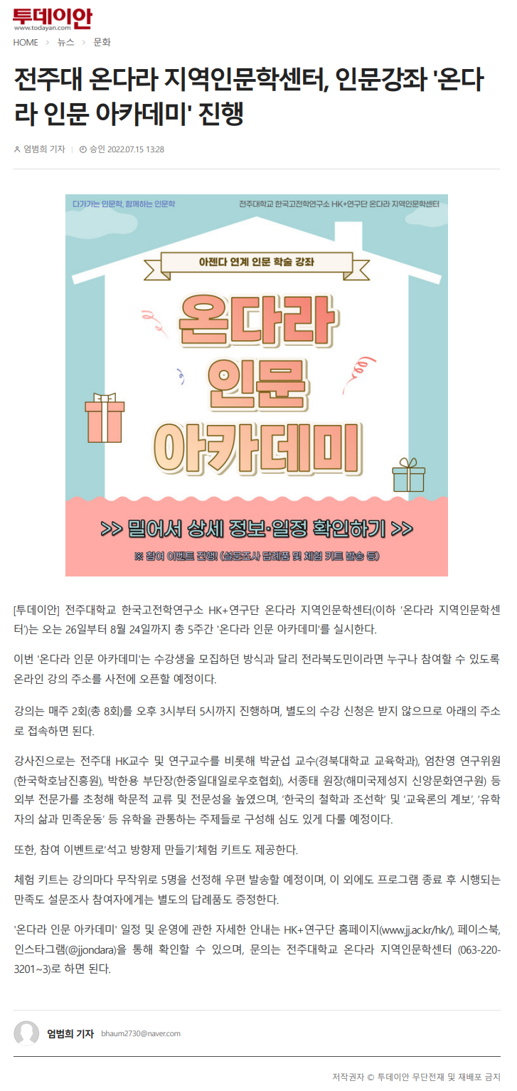 | 557 | 기타 | 전주대 온다라 지역인문학센터, 인문강좌 '온다라 인문 아카데미' 진행 | 온다라 지역인문학센터 | 22-07-19 | 205 |