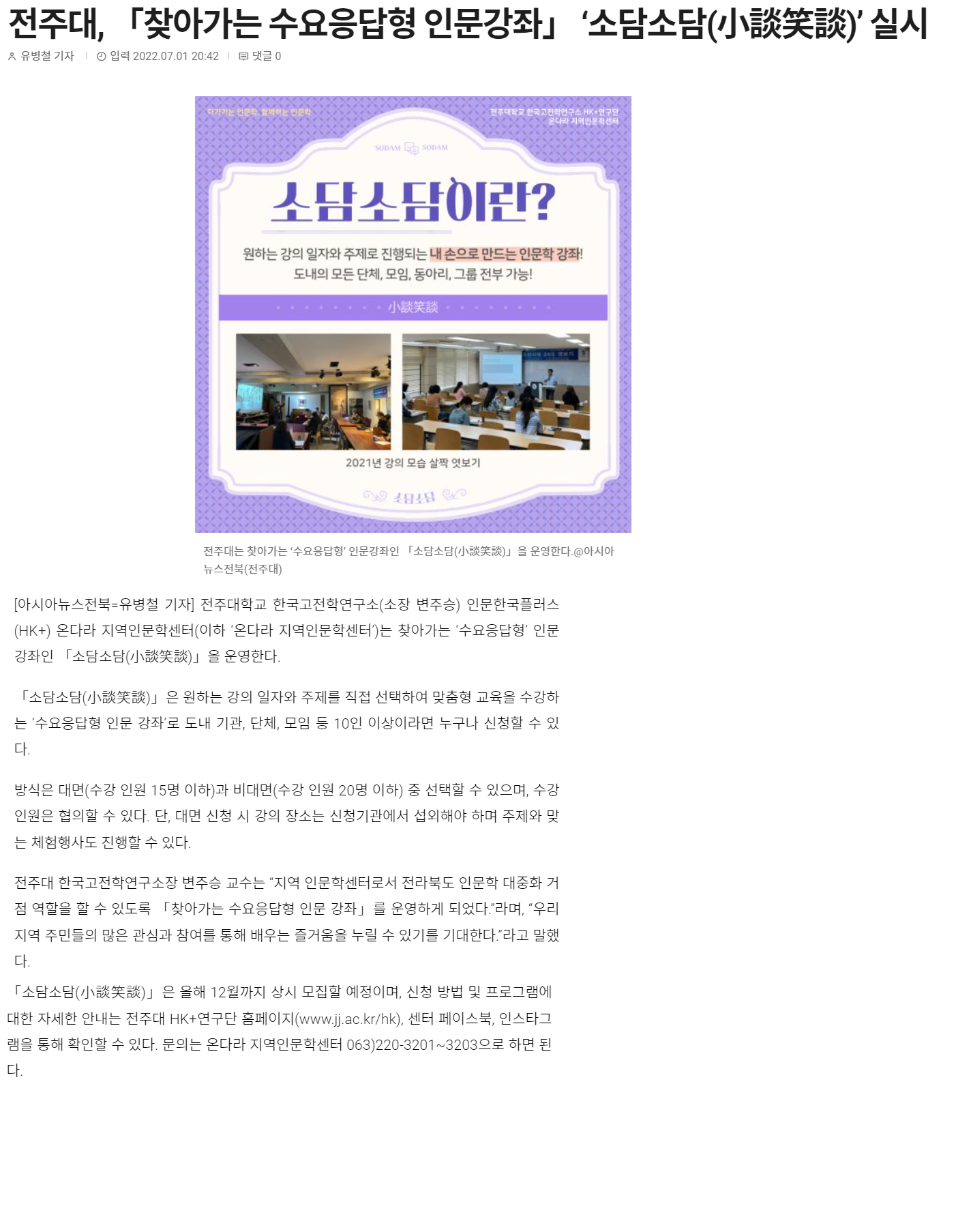 | 549 | 기타 | 전주대, 찾아가는 수요응답형 인문강좌 ‘소담소담’ 실시 | 온다라 지역인문학센터 | 22-07-04 | 186 |