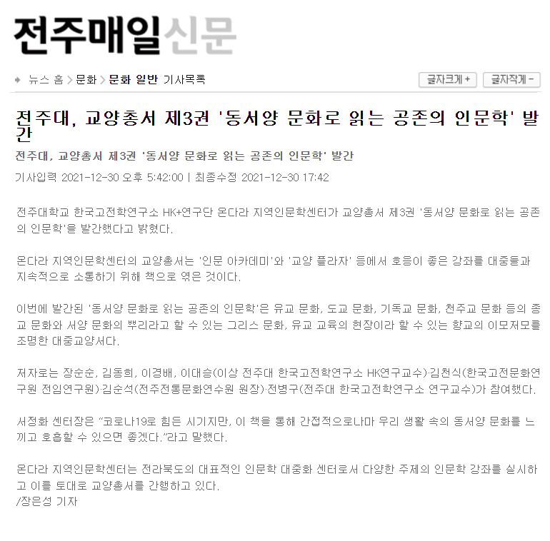 | 500 | 기타 | 전주대, 교양총서 제3권 '동서양 문화로 읽는 공존의 인문학' 발간 | 온다라 지역인문학센터 | 22-02-07 | 187 |