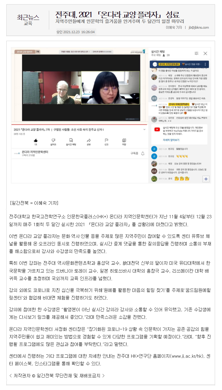 | 503 | 기타 | 전주대, 2021 `온다라 교양 플라자` 성료 | 온다라 지역인문학센터 | 22-02-07 | 171 |