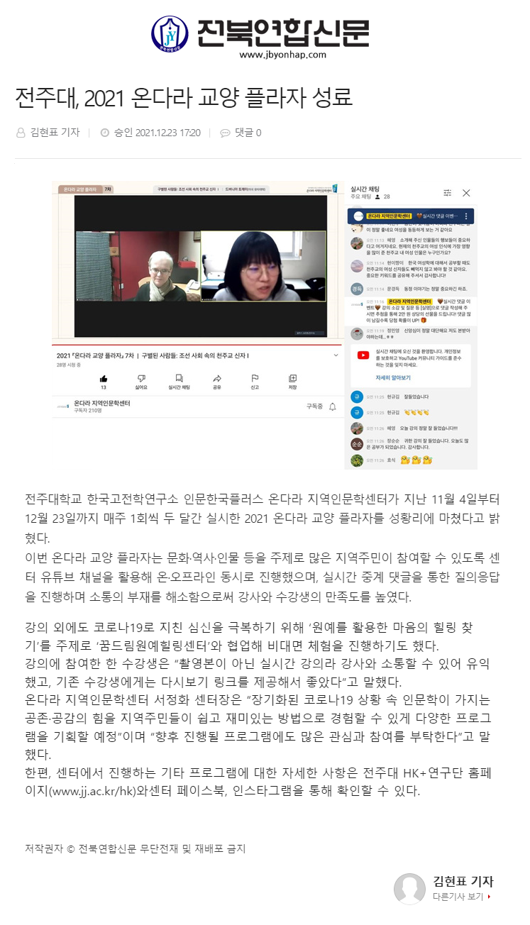 | 501 | 기타 | 전주대, 2021 '온다라 교양 플라자' 성료 | 온다라 지역인문학센터 | 22-02-07 | 180 |