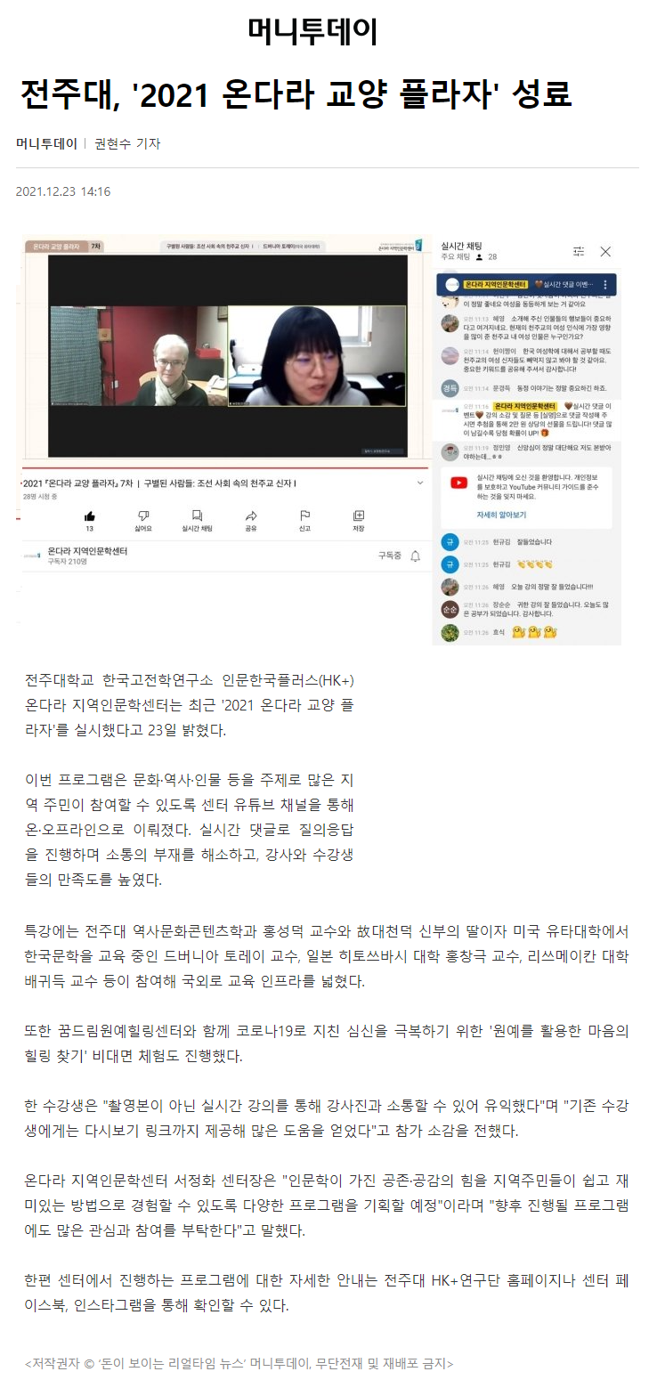 | 508 | 기타 | 전주대, '2021 온다라 교양 플라자' 성료 | 온다라 지역인문학센터 | 22-02-07 | 189 |