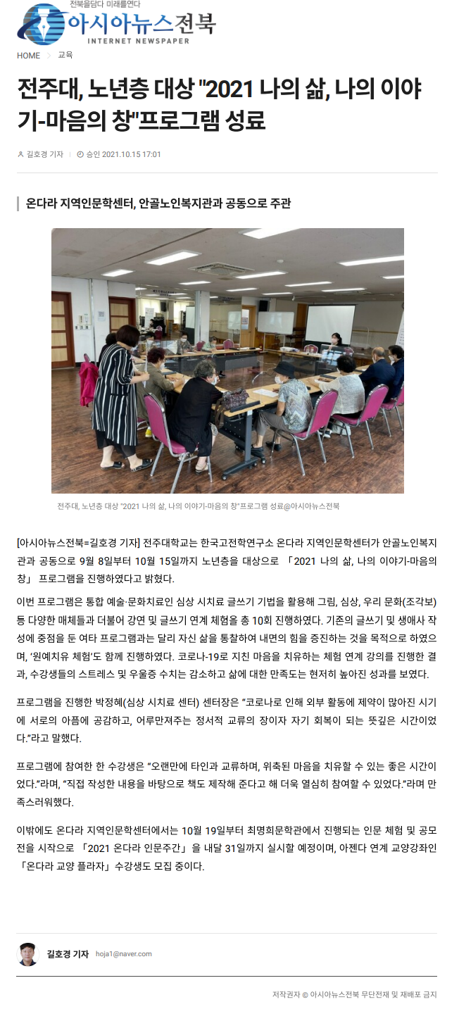 | 490 | 기타 | 전주대, 노년층 대상 "2021 나의 삶, 나의 이야기-마음의 창"프로그램 성료 | 온다라 지역인문학센터 | 22-01-25 | 193 |