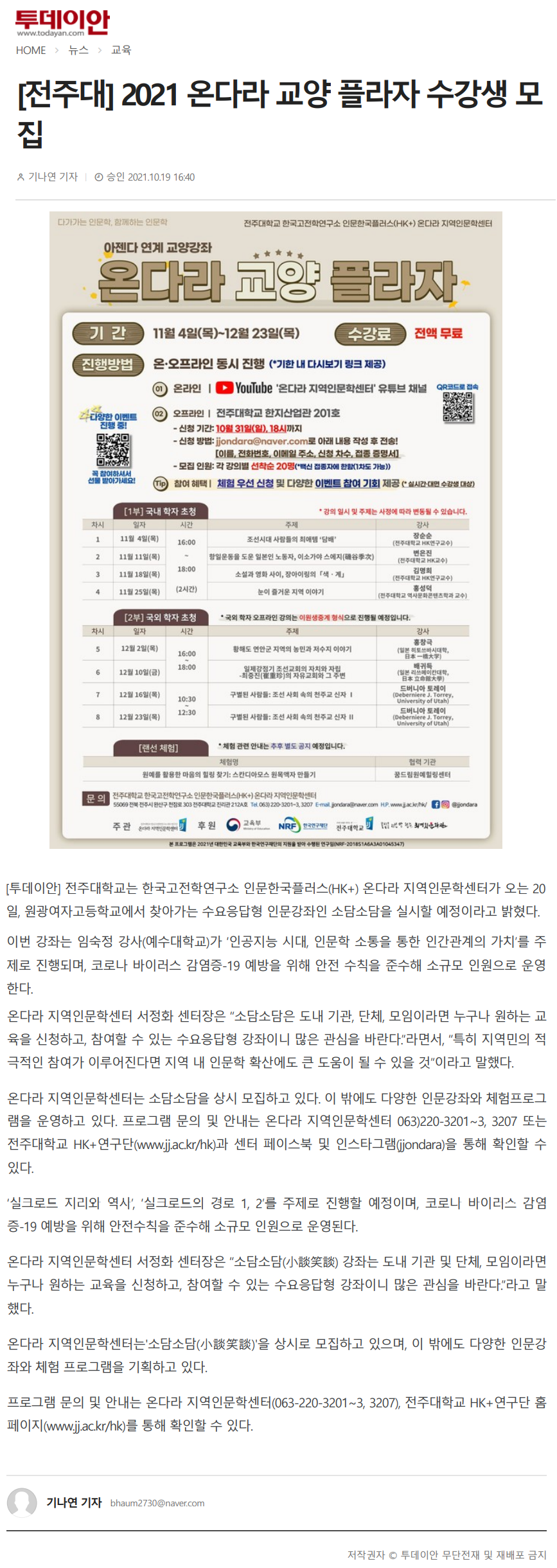 | 491 | 기타 | [전주대] 2021 온다라 교양 플라자 수강생 모집 | 온다라 지역인문학센터 | 22-01-25 | 195 |