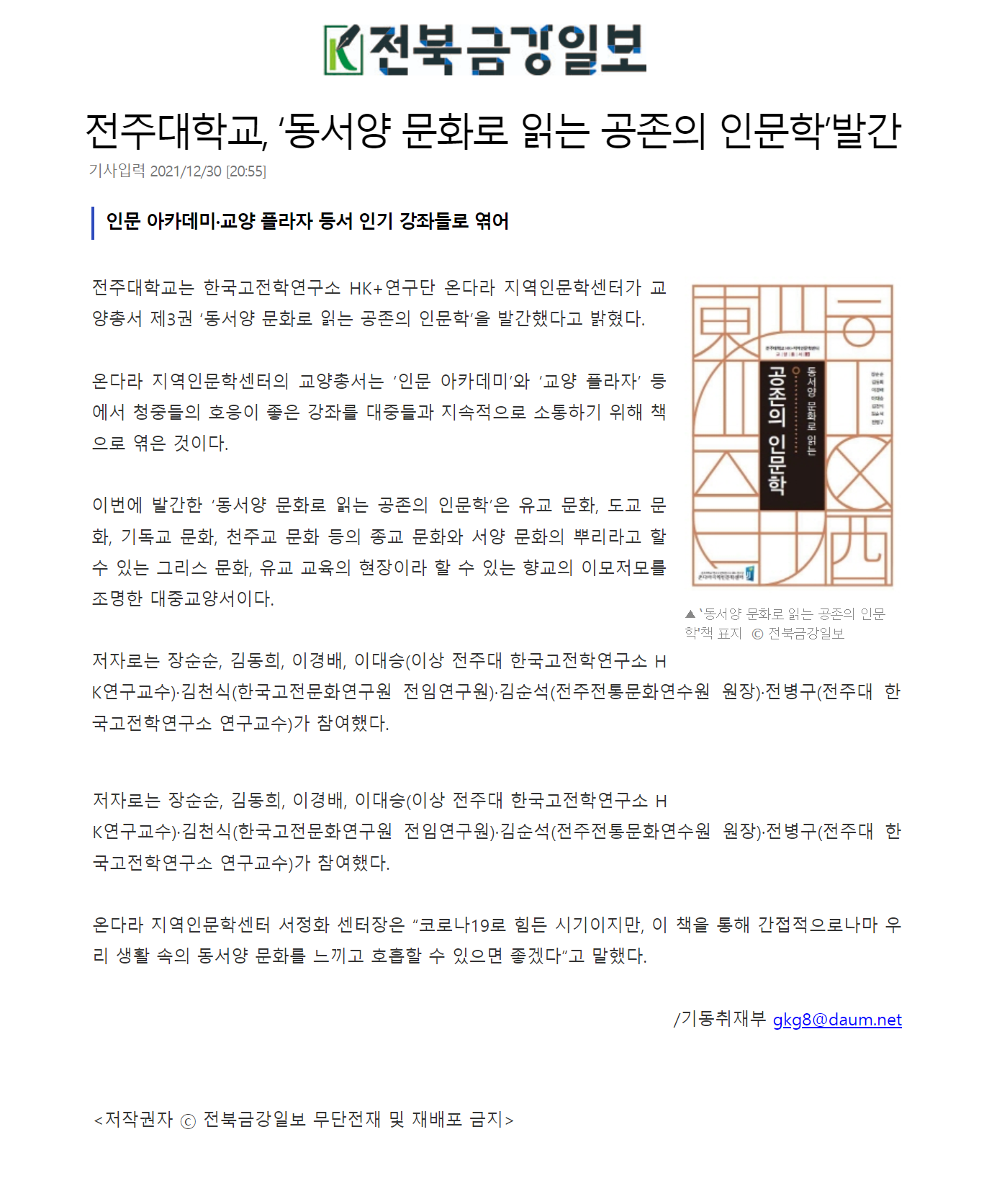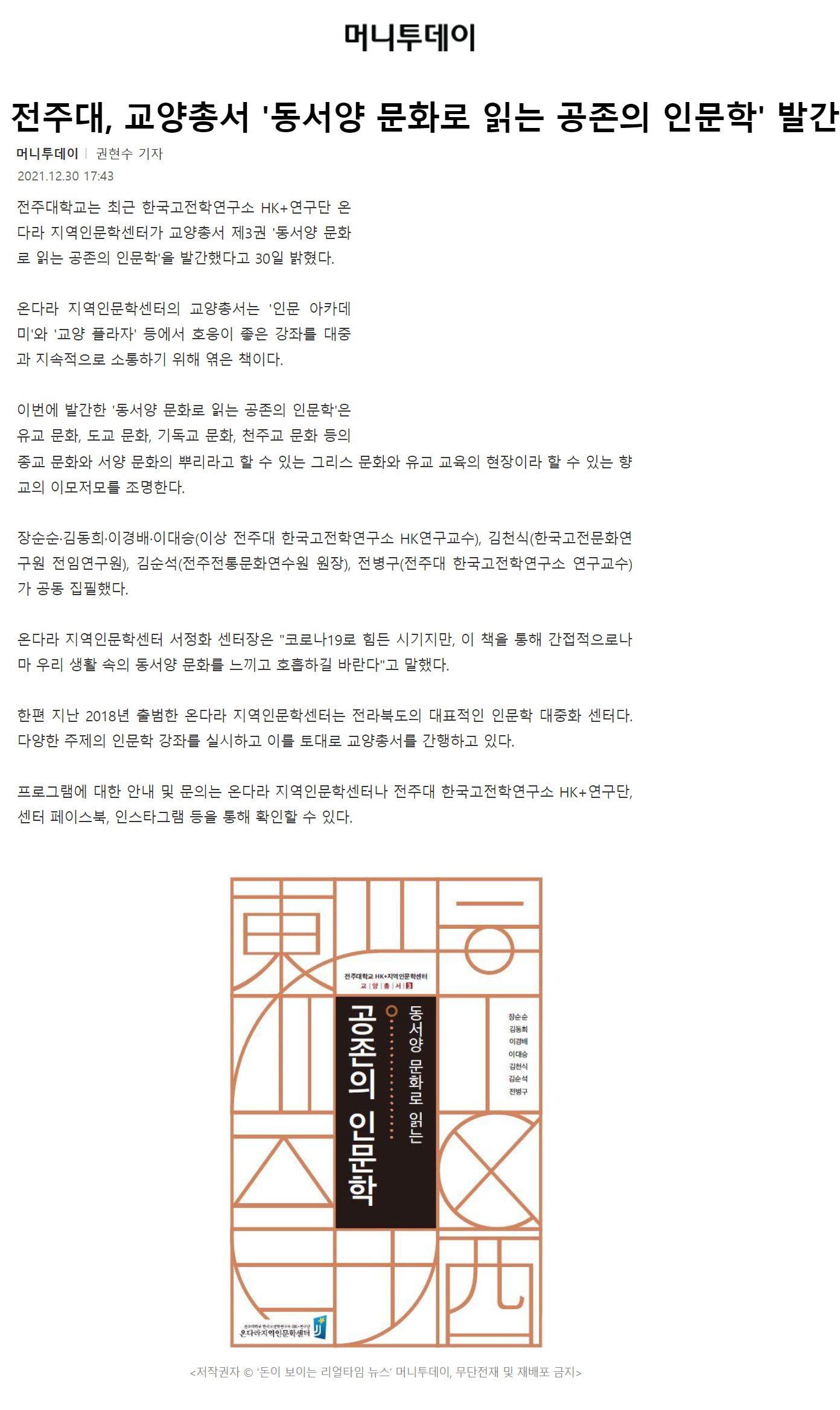 | 496 | 기타 | 전주대학교, ‘동서양 문화로 읽는 공존의 인문학’발간 | 온다라 지역인문학센터 | 22-01-28 | 191 |