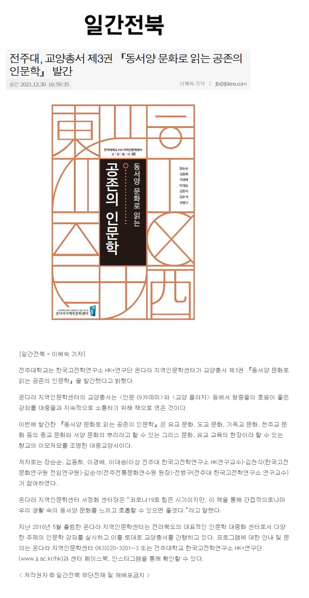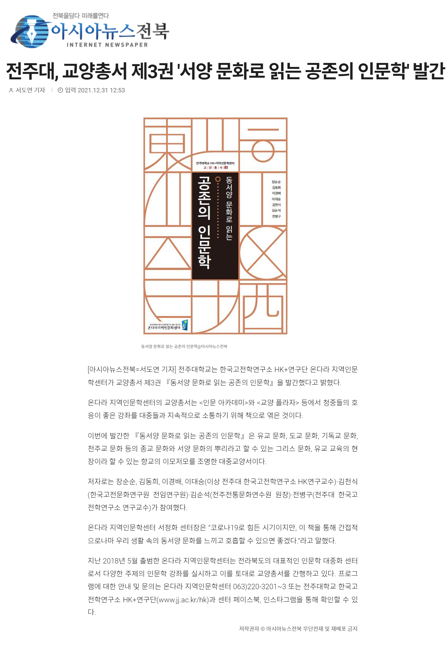 | 498 | 기타 | 전주대, 교양총서 제3권 '동서양 문화로 읽는 공존의 인문학' 발간 | 온다라 지역인문학센터 | 22-01-28 | 189 |