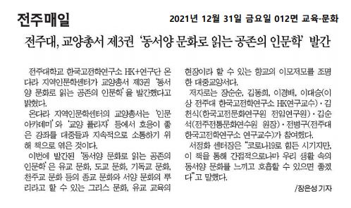 | 492 | 기타 | [전주대] 교양총서 제3권 '동서양 문화로 읽는 공존의 인문학' 발간 | 온다라 지역인문학센터 | 22-01-28 | 192 |