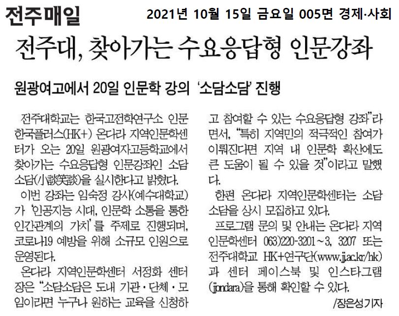 | 449 | 기타 | 전주대, 찾아가는 수요응답형 인문강좌 | 온다라 지역인문학센터 | 21-10-20 | 192 |
