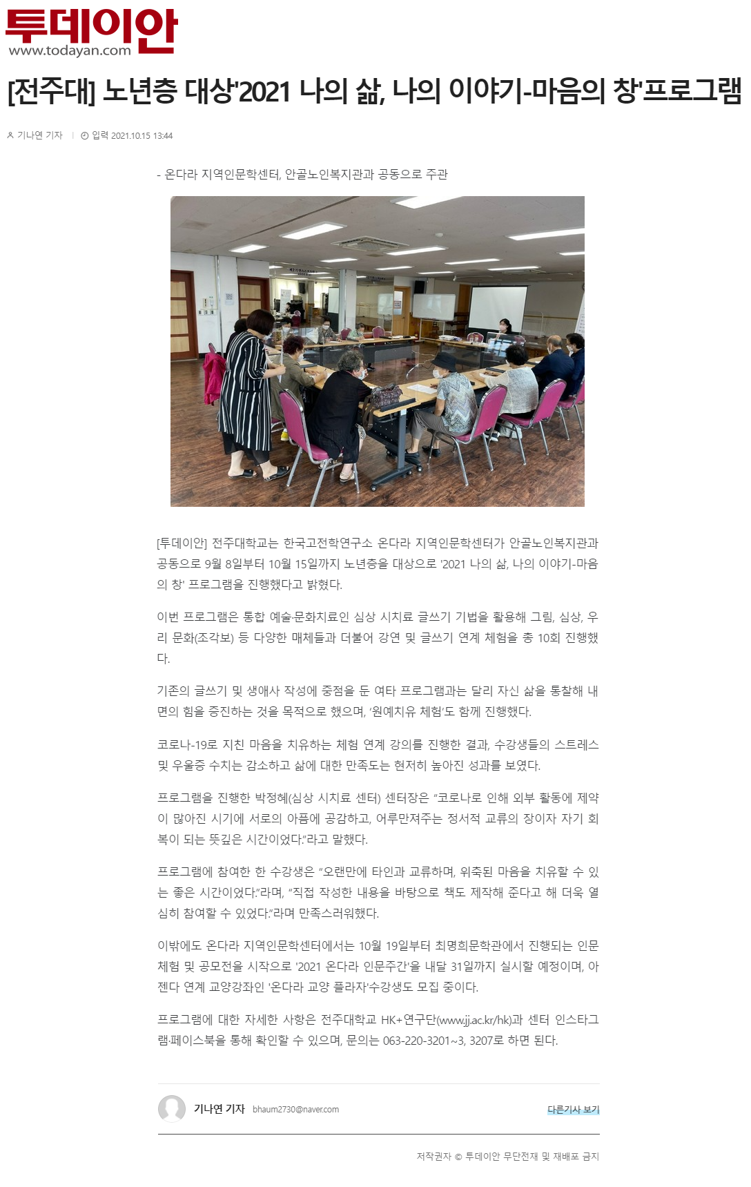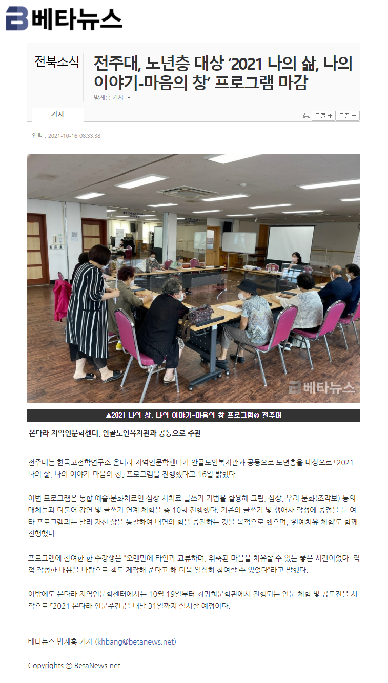 | 453 | 기타 | 전주대, 노년층 대상「2021 나의 삶, 나의 이야기-마음의 창」프로그램 성료 | 온다라 지역인문학센터 | 21-10-20 | 202 |
