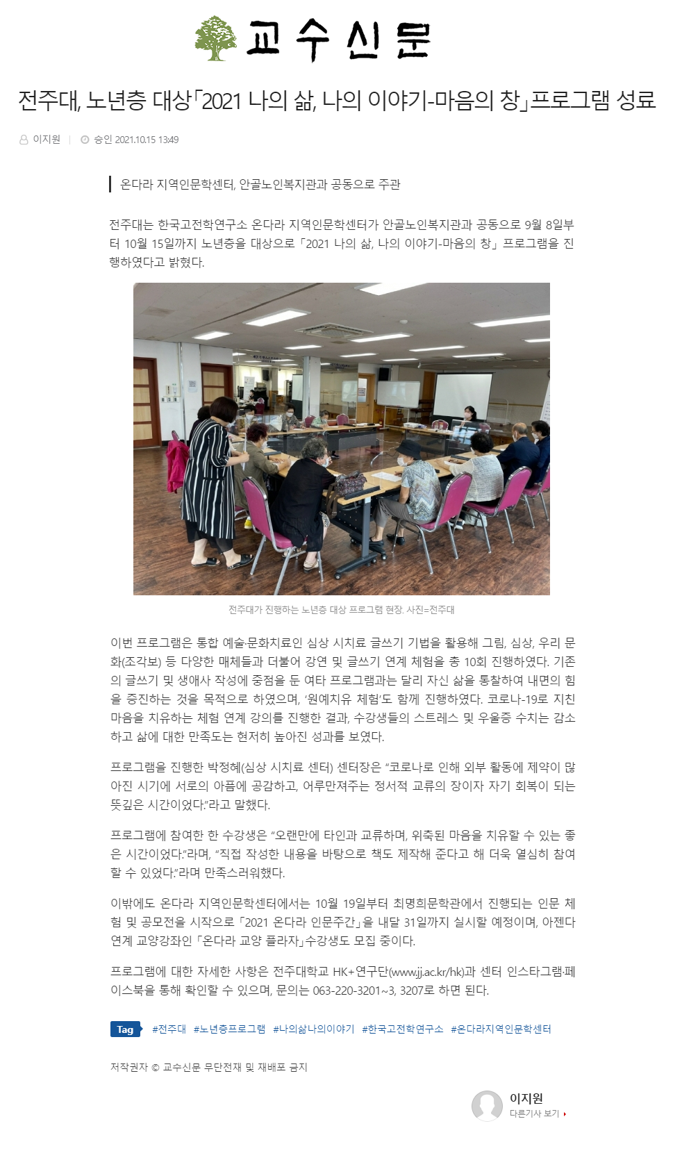 | 454 | 기타 | 전주대, 노년층 대상「2021 나의 삶, 나의 이야기-마음의 창」프로그램 성료 | 온다라 지역인문학센터 | 21-10-20 | 195 |