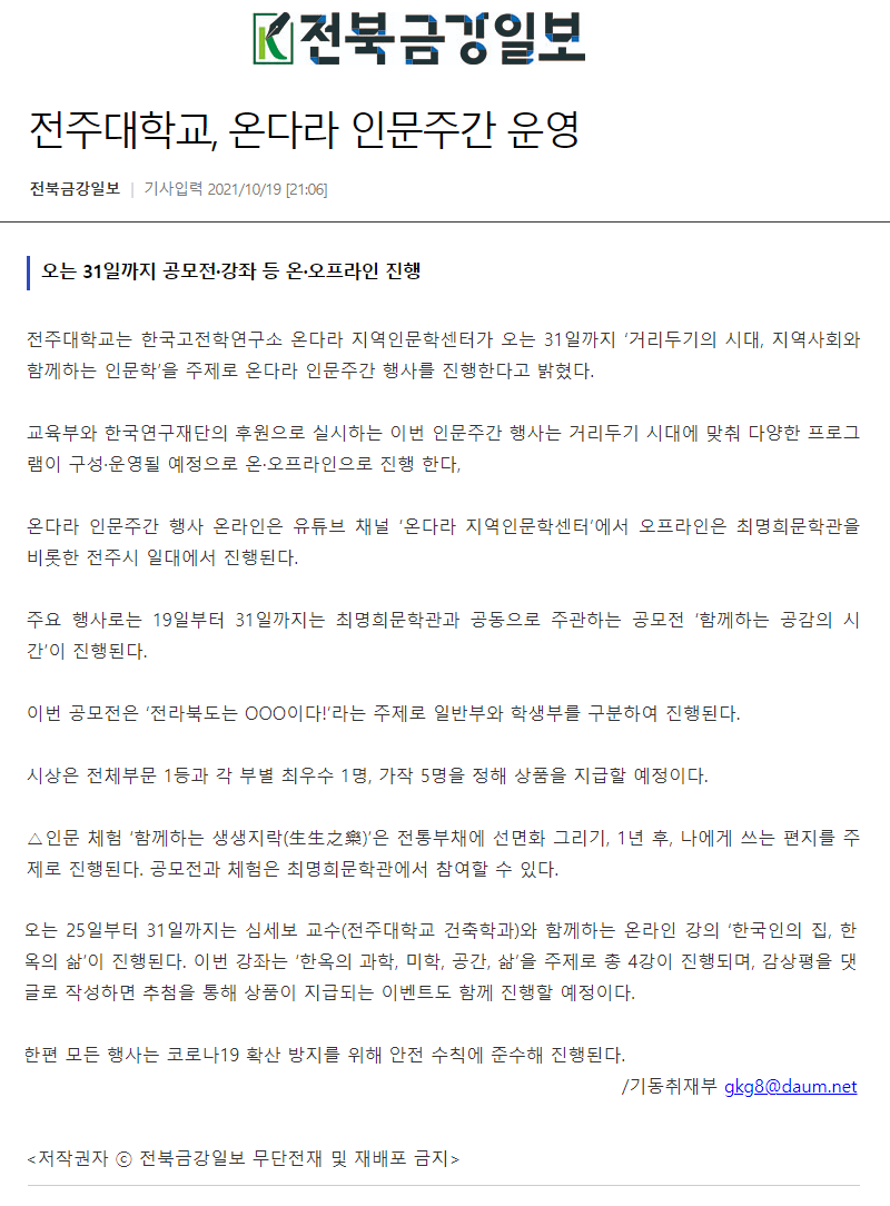 | 457 | 기타 | 전주대, 지역사회와 함께하는 인문학 ‘온다라 인문주간’행사 진행 | 온다라 지역인문학센터 | 21-10-20 | 194 |