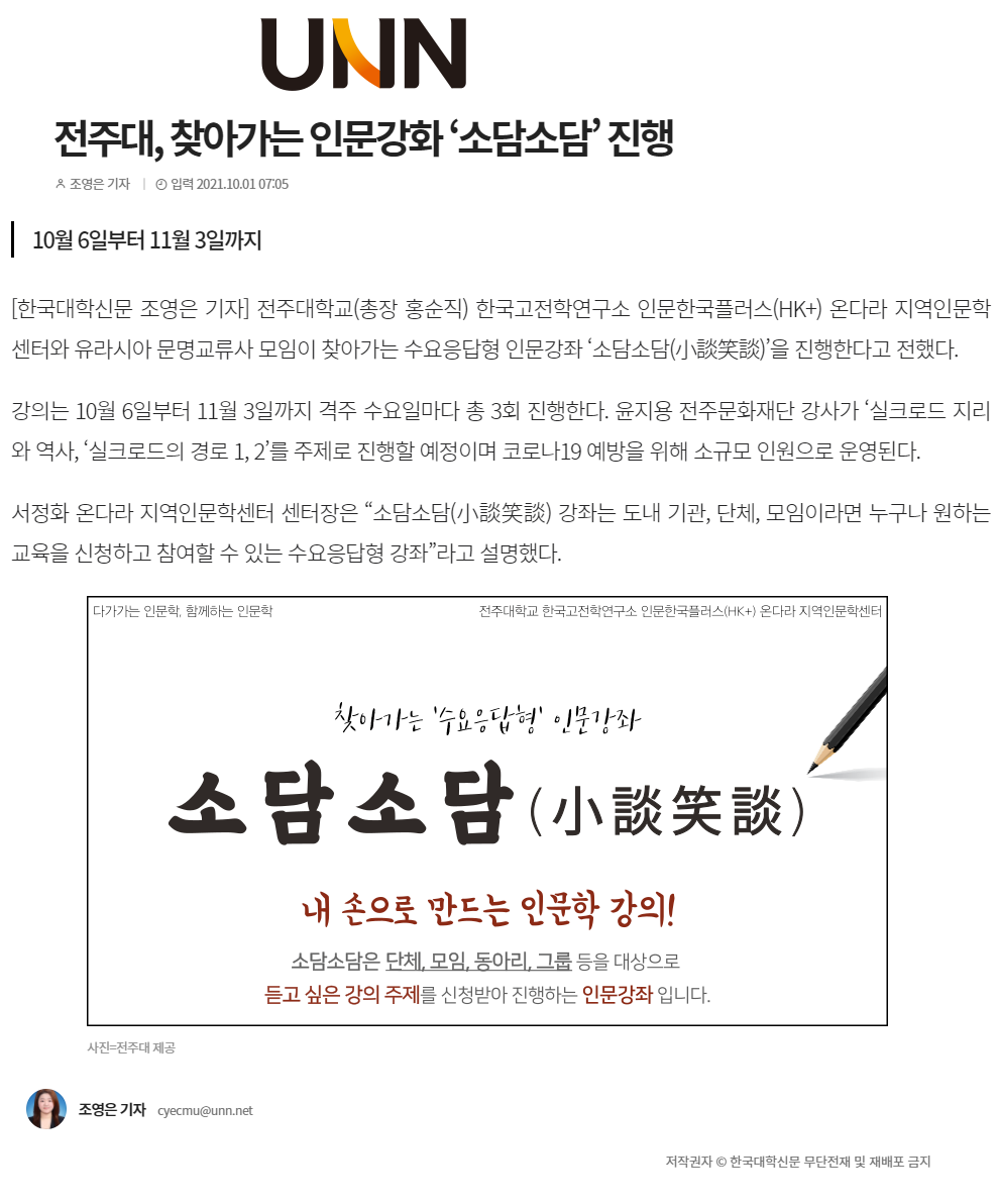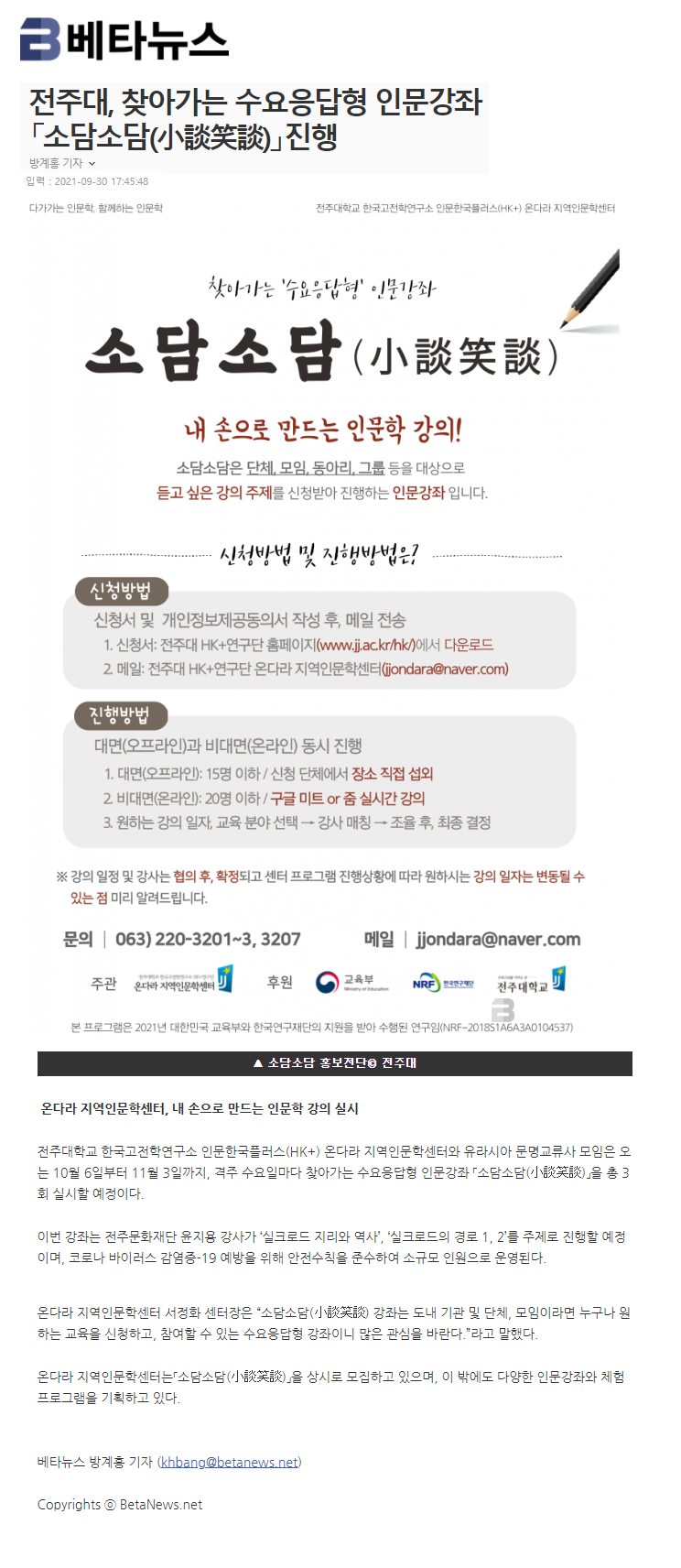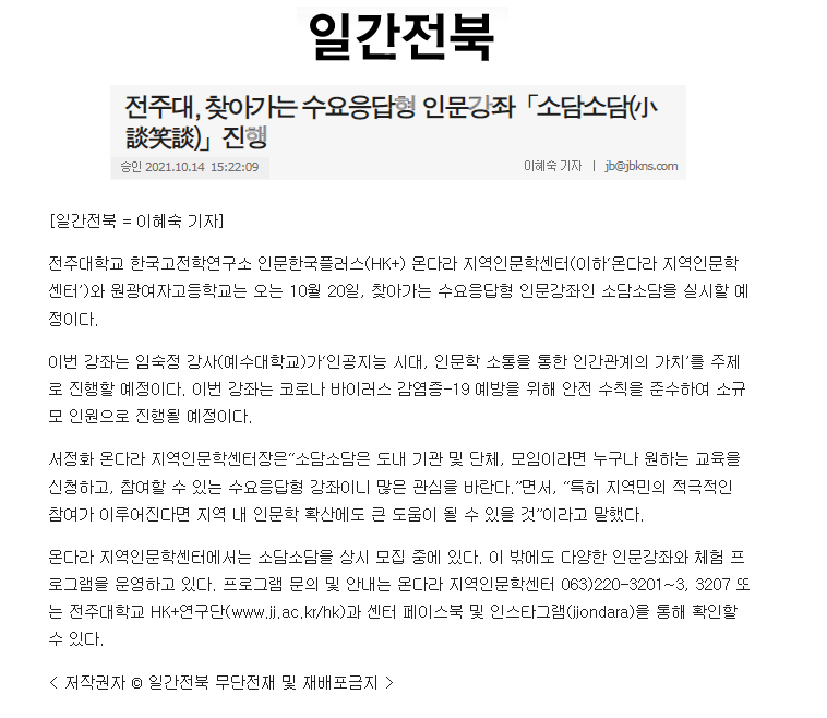 | 448 | 기타 | 전주대, 찾아가는 수요응답형 인문강좌「소담소담(小談笑談)」진행 | 온다라 지역인문학센터 | 21-10-20 | 213 |