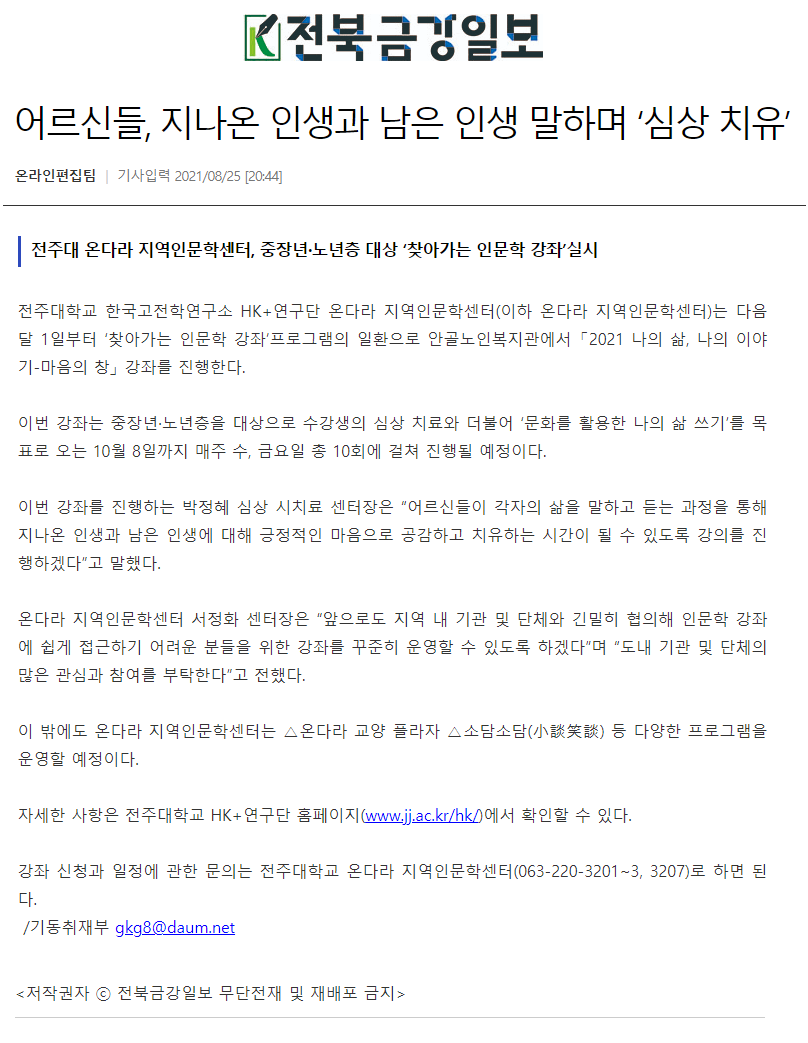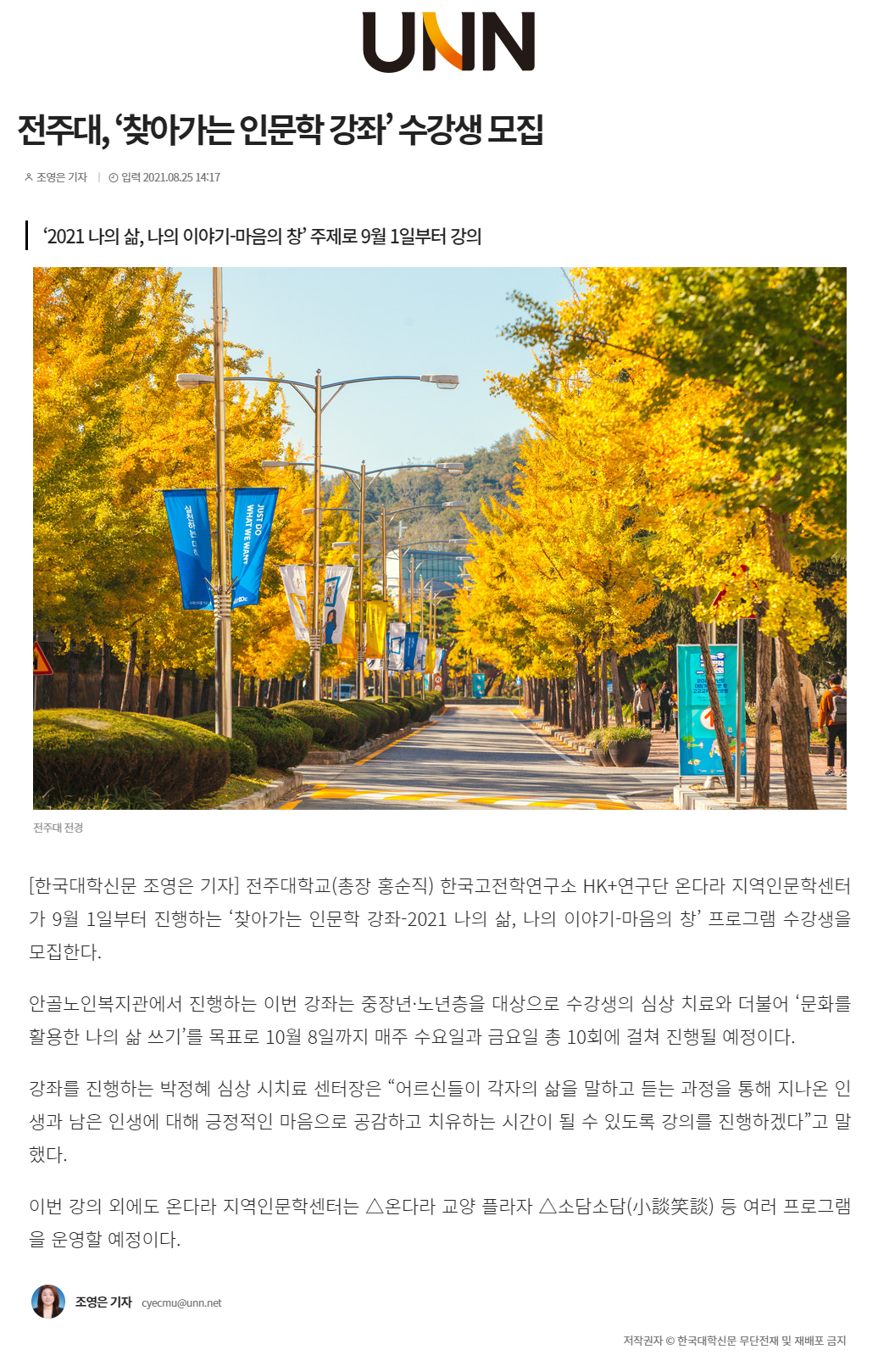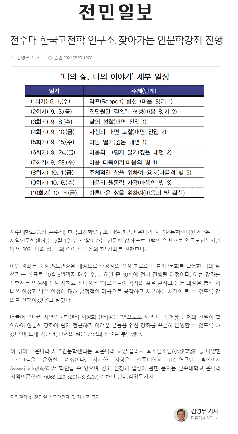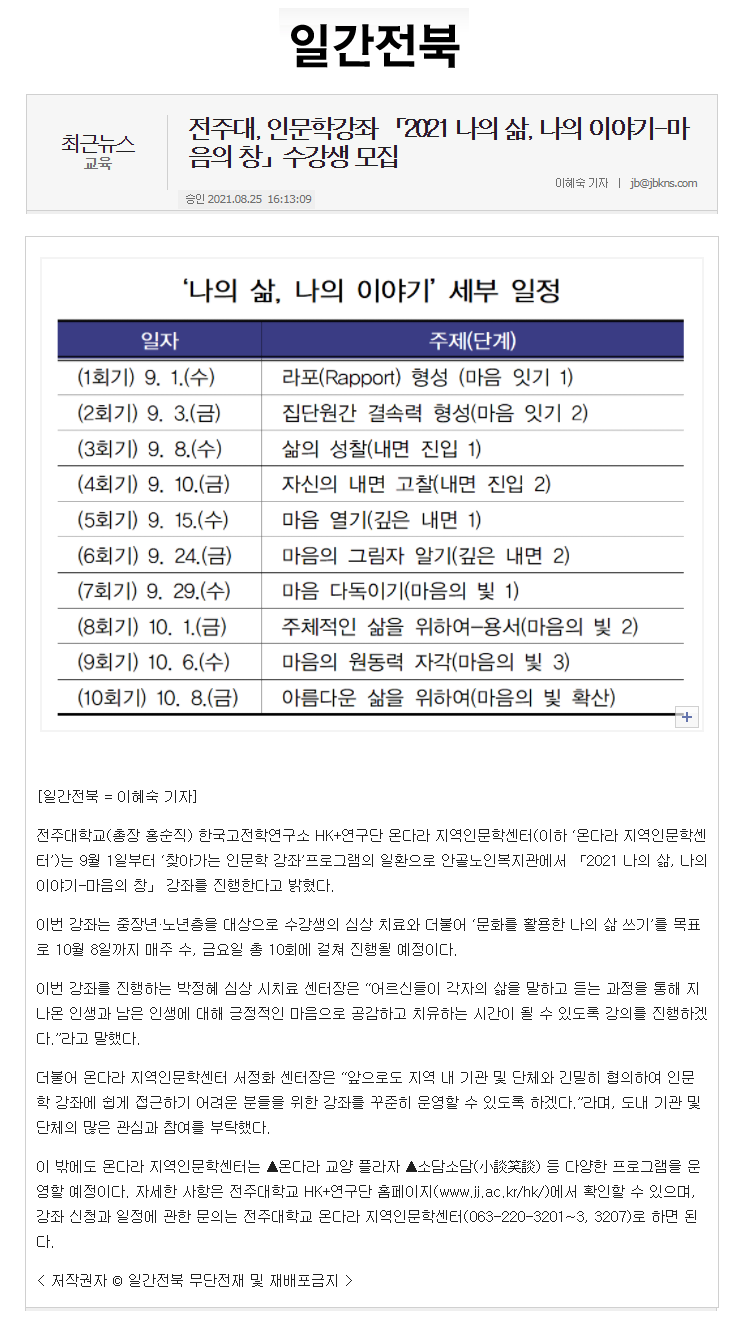 403 기타 전주대, 인문학강좌 「2021 나의 삶, 나의 이야기-마음의 창」 수강생 모집 온다라 지역인문학센터 21-09-08 200   210825_전주대, 인문학강좌 「2021 나의 삶, 나의 이야기-마음의 창」 수강생 모집_일간전북.png