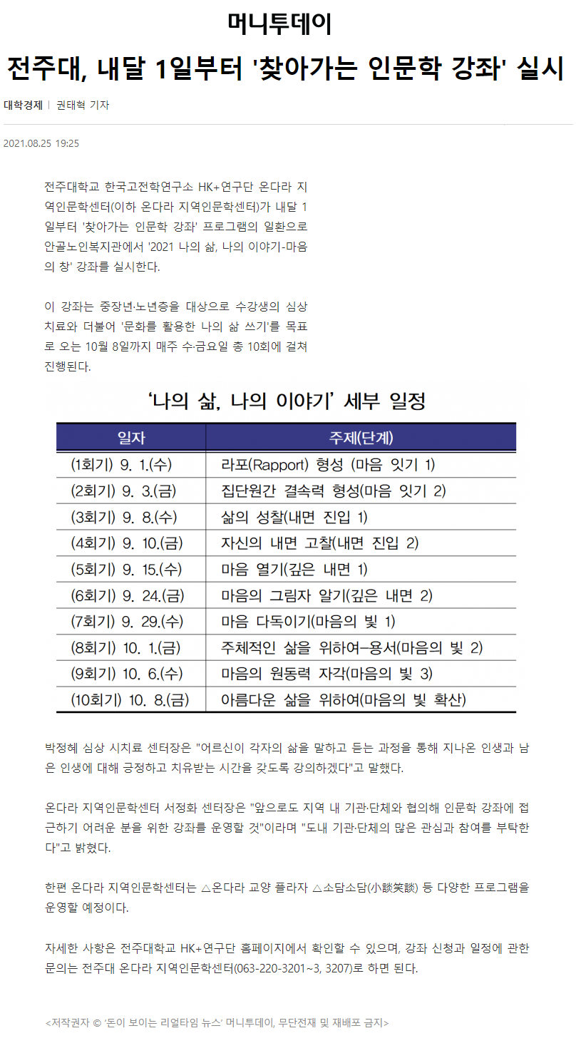 402 기타 전주대, 내달 1일부터 '찾아가는 인문학 강좌' 실시 온다라 지역인문학센터 21-09-08 204   210825_전주대, 내달 1일부터 '찾아가는 인문학 강좌' 실시_머니투데이.png