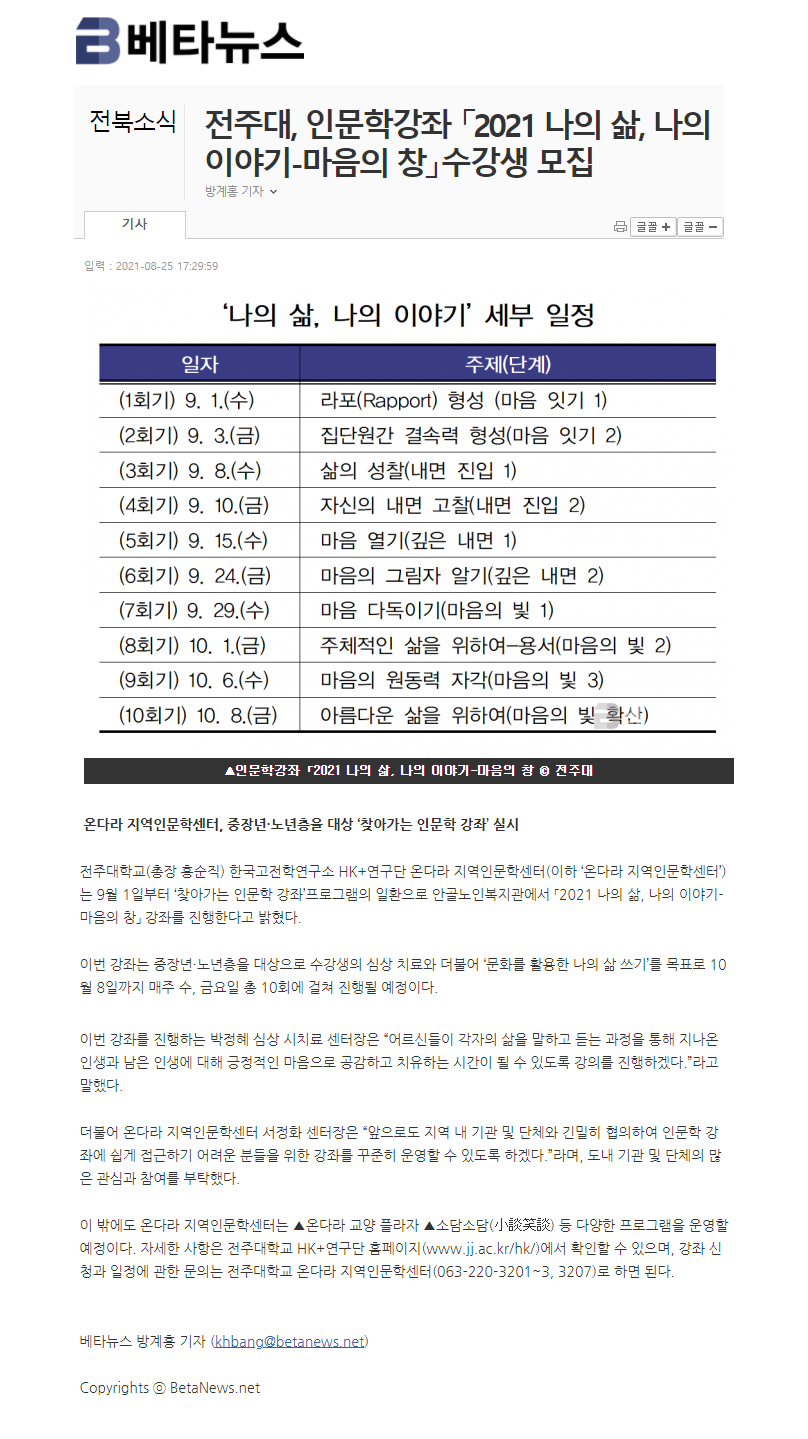 404 기타 전주대, 인문학강좌 「2021 나의 삶, 나의 이야기-마음의 창」수강생 모집 온다라 지역인문학센터 21-09-08 183   210825_전주대, 인문학강좌 「2021 나의 삶, 나의 이야기-마음의 창」수강생 모집_베타뉴스.png