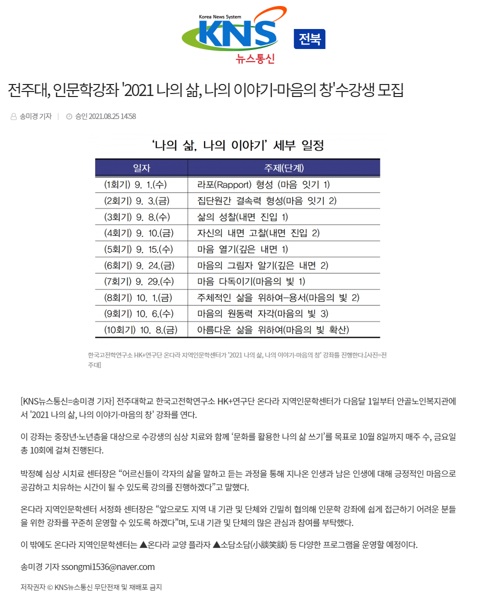 406 기타 전주대, 인문학강좌 '2021 나의 삶, 나의 이야기-마음의 창'수강생 모집 온다라 지역인문학센터 21-09-08 192   210825_전주대, 인문학강좌 '2021 나의 삶, 나의 이야기-마음의 창'수강생 모집_KNS뉴스통신.png
