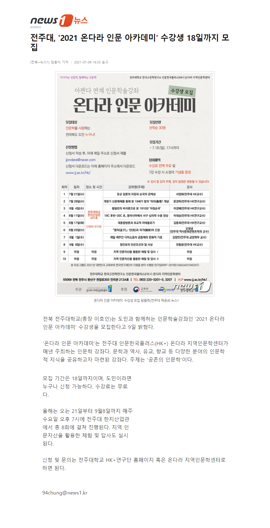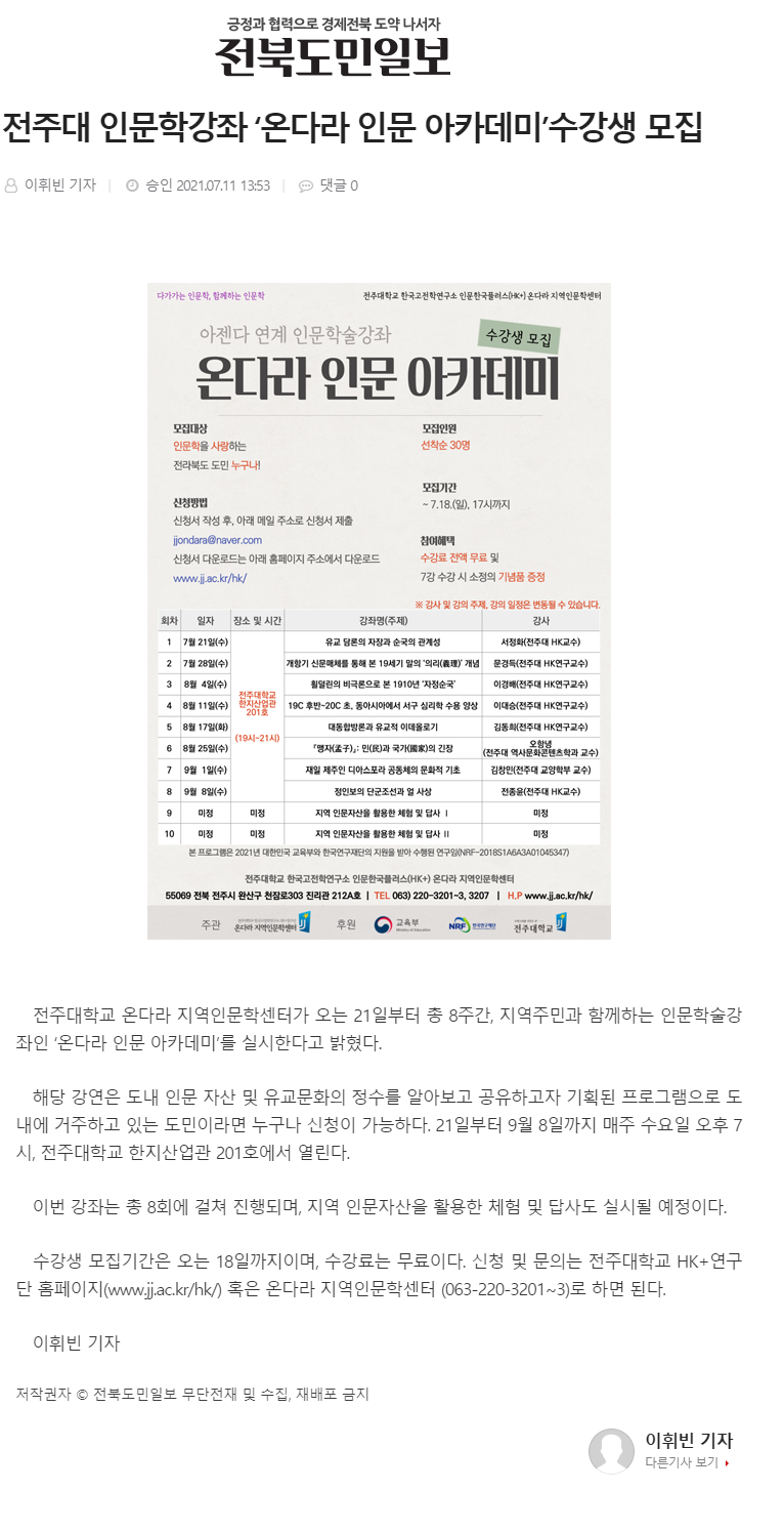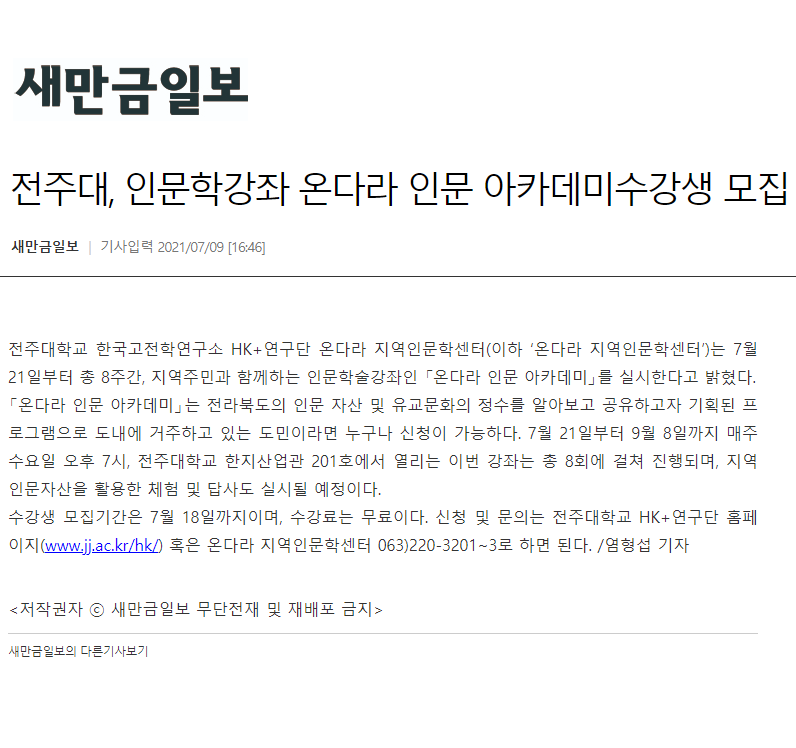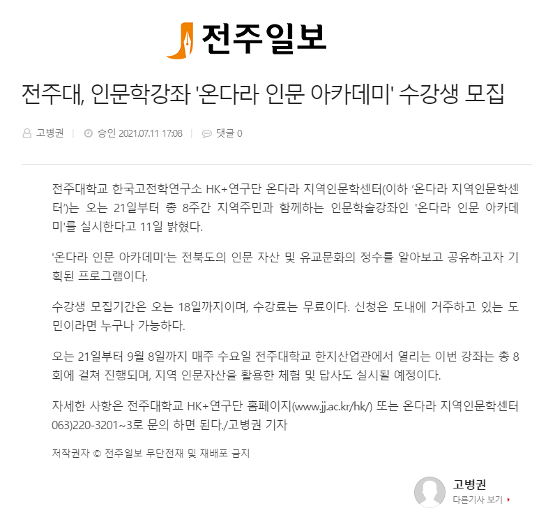 | 388 | 기타 | 전주대, 인문학강좌 '온다라 인문 아카데미' 수강생 모집 | 온다라 지역인문학센터 | 21-07-14 | 187 |