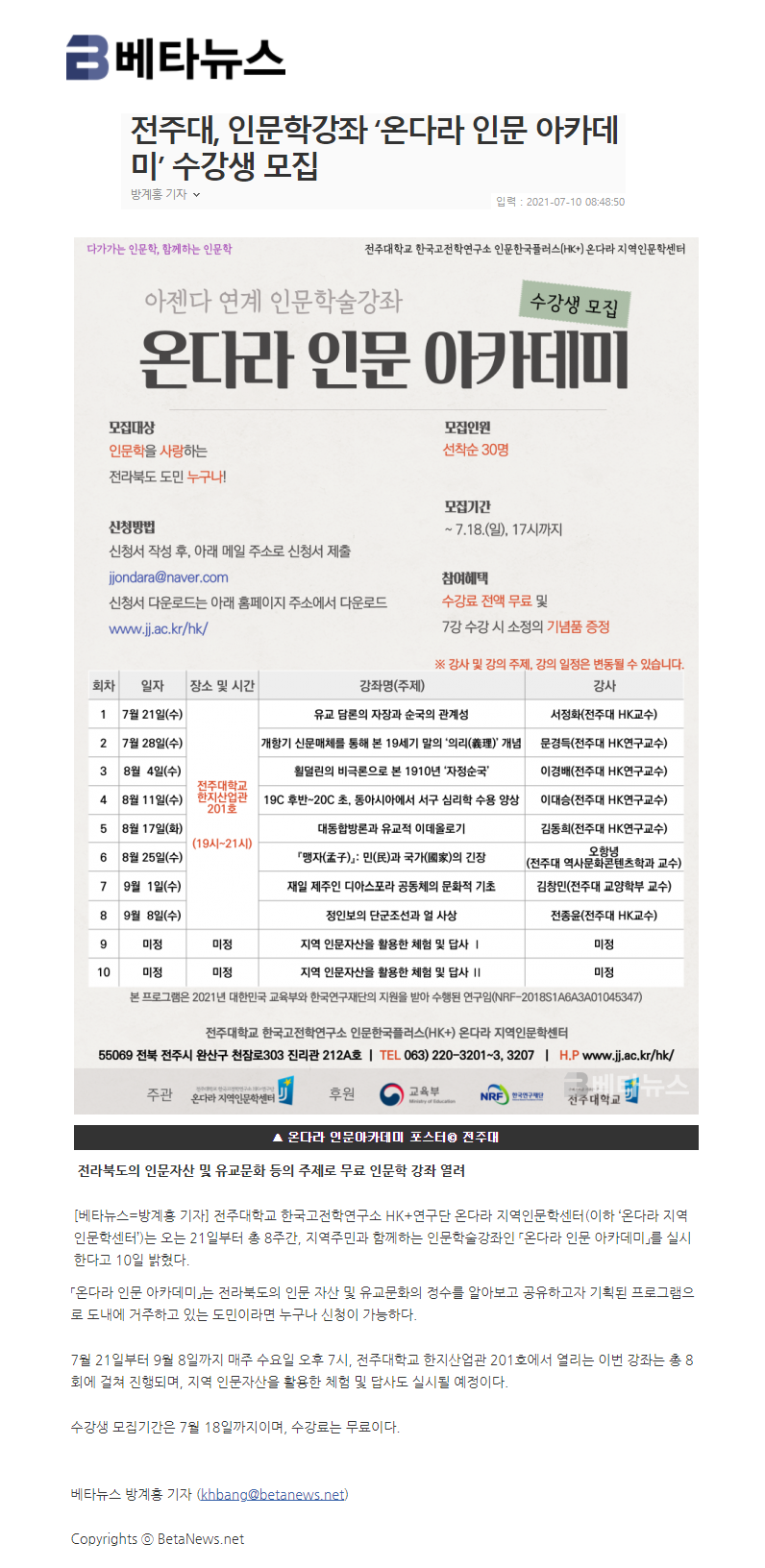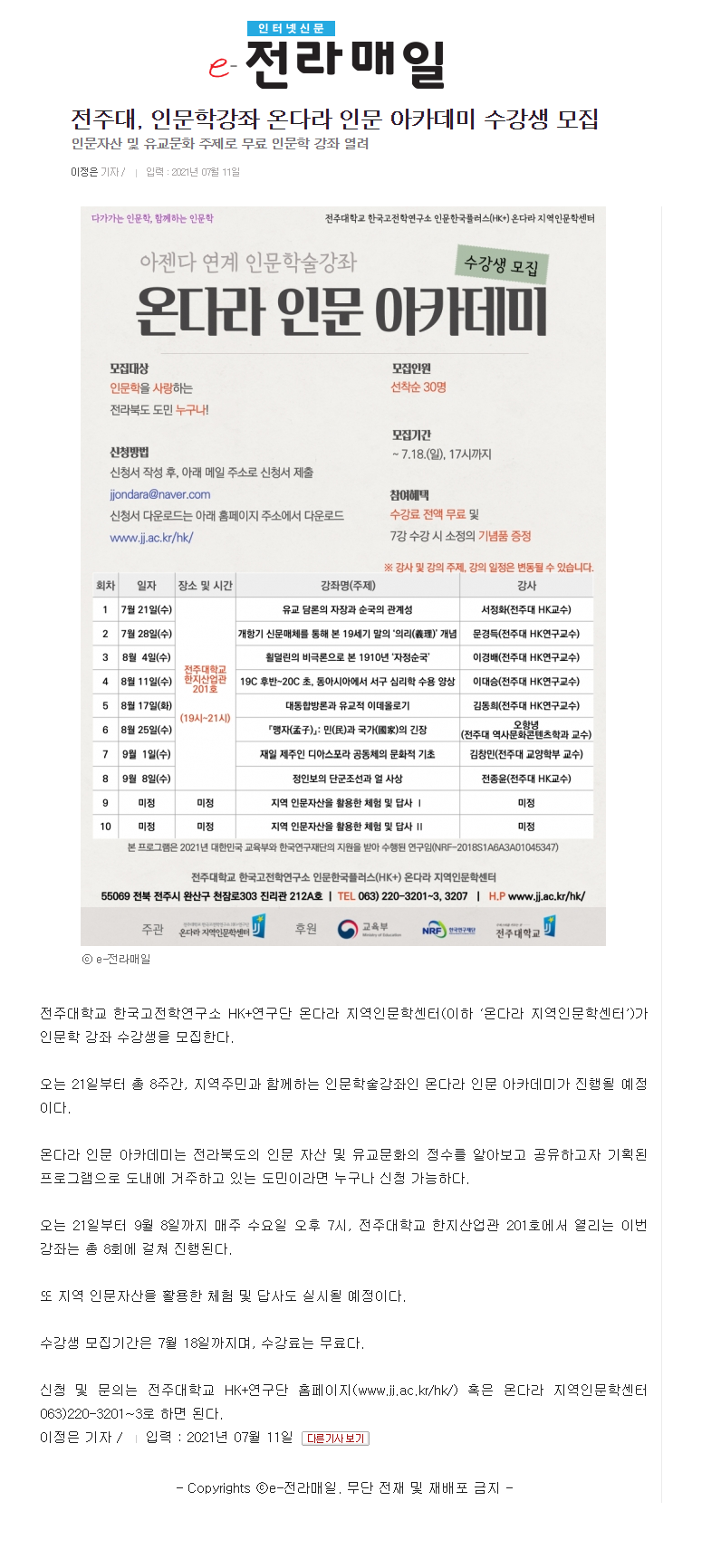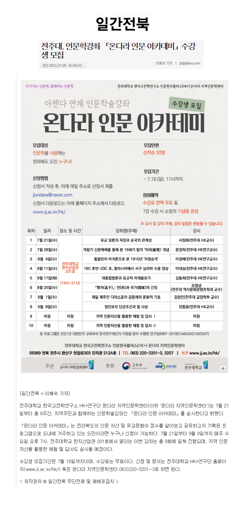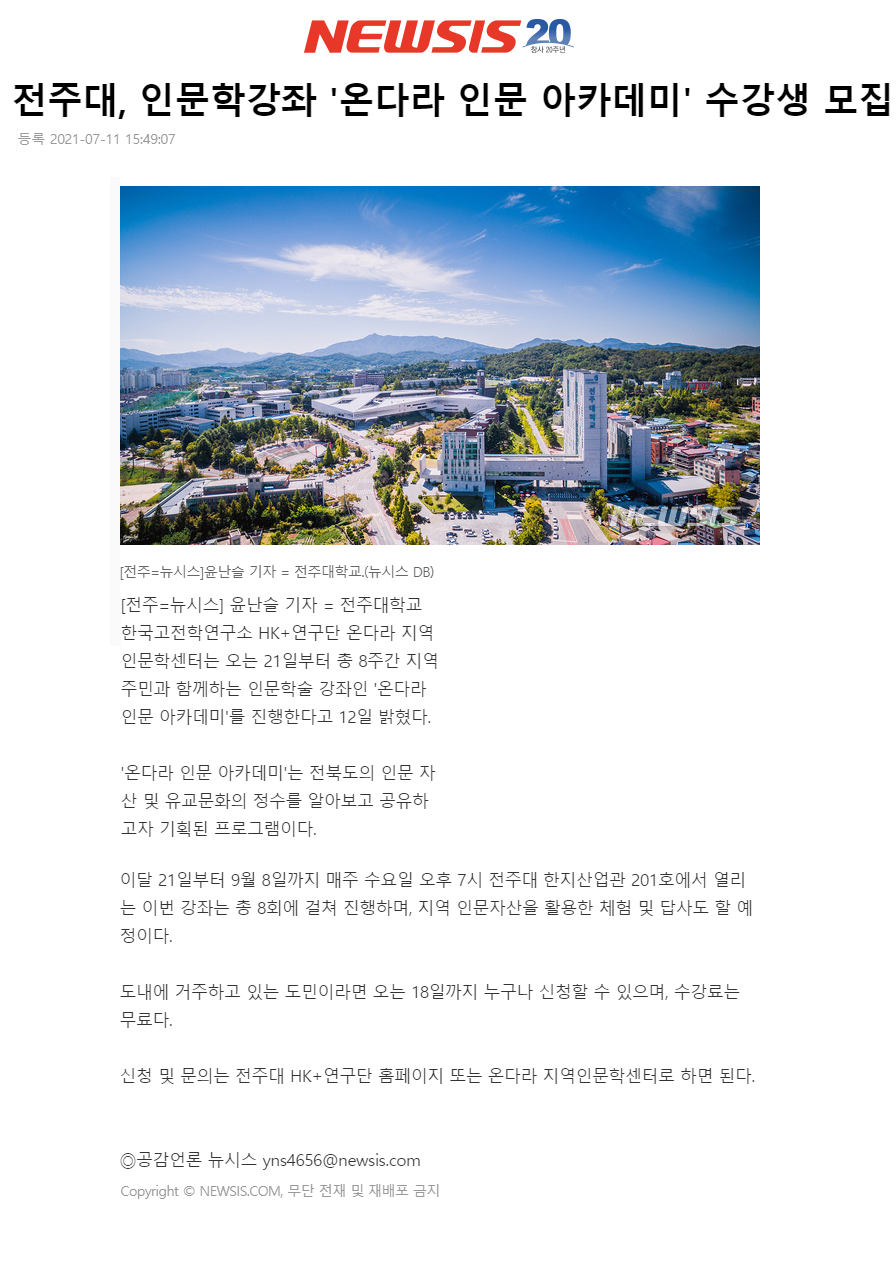 | 381 | 기타 | 전주대, 인문학강좌 「온다라 인문 아카데미」 수강생 모집 | 온다라 지역인문학센터 | 21-07-14 | 187 |