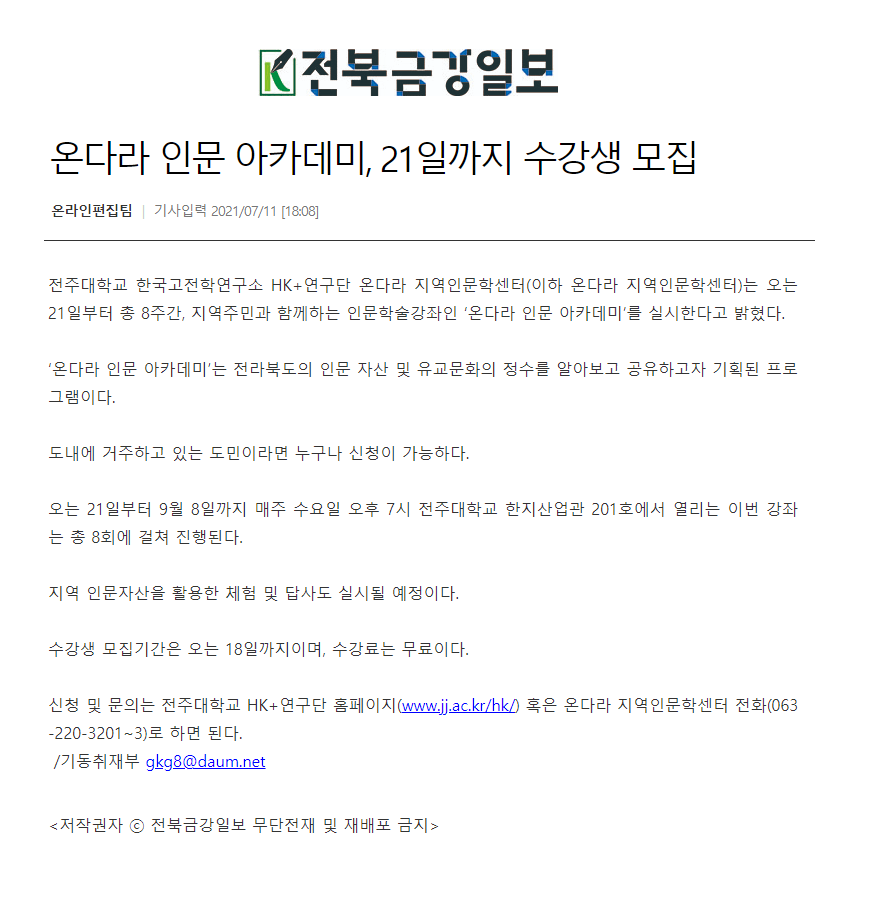 | 382 | 기타 | 전주대, 인문학강좌 온다라 인문 아카데미 수강생 모집 | 온다라 지역인문학센터 | 21-07-14 | 187 |