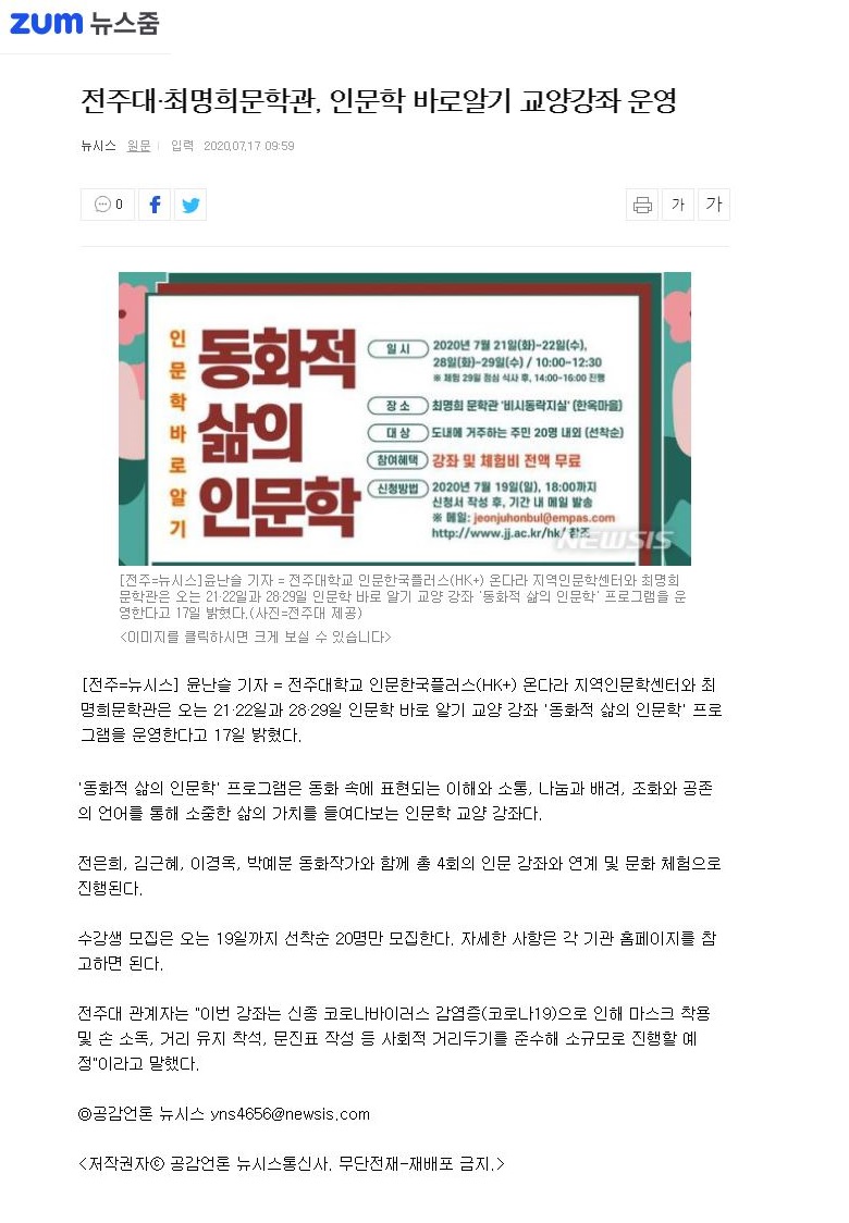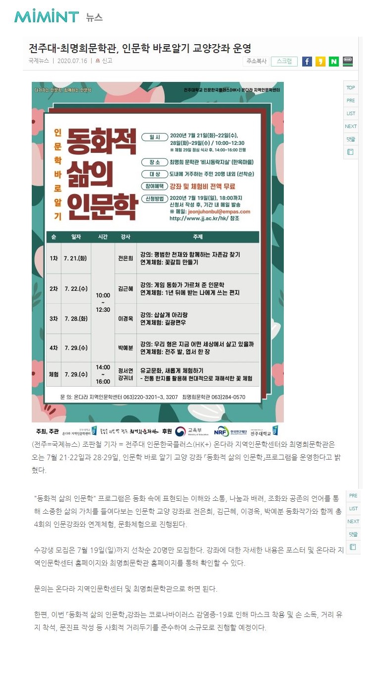 | 288 | 기타 | 전주대-최명희문학관 '동화적 삶의 인문학' 프로그램 성료 | 온다라 지역인문학센터 | 20-08-03 | 206 |