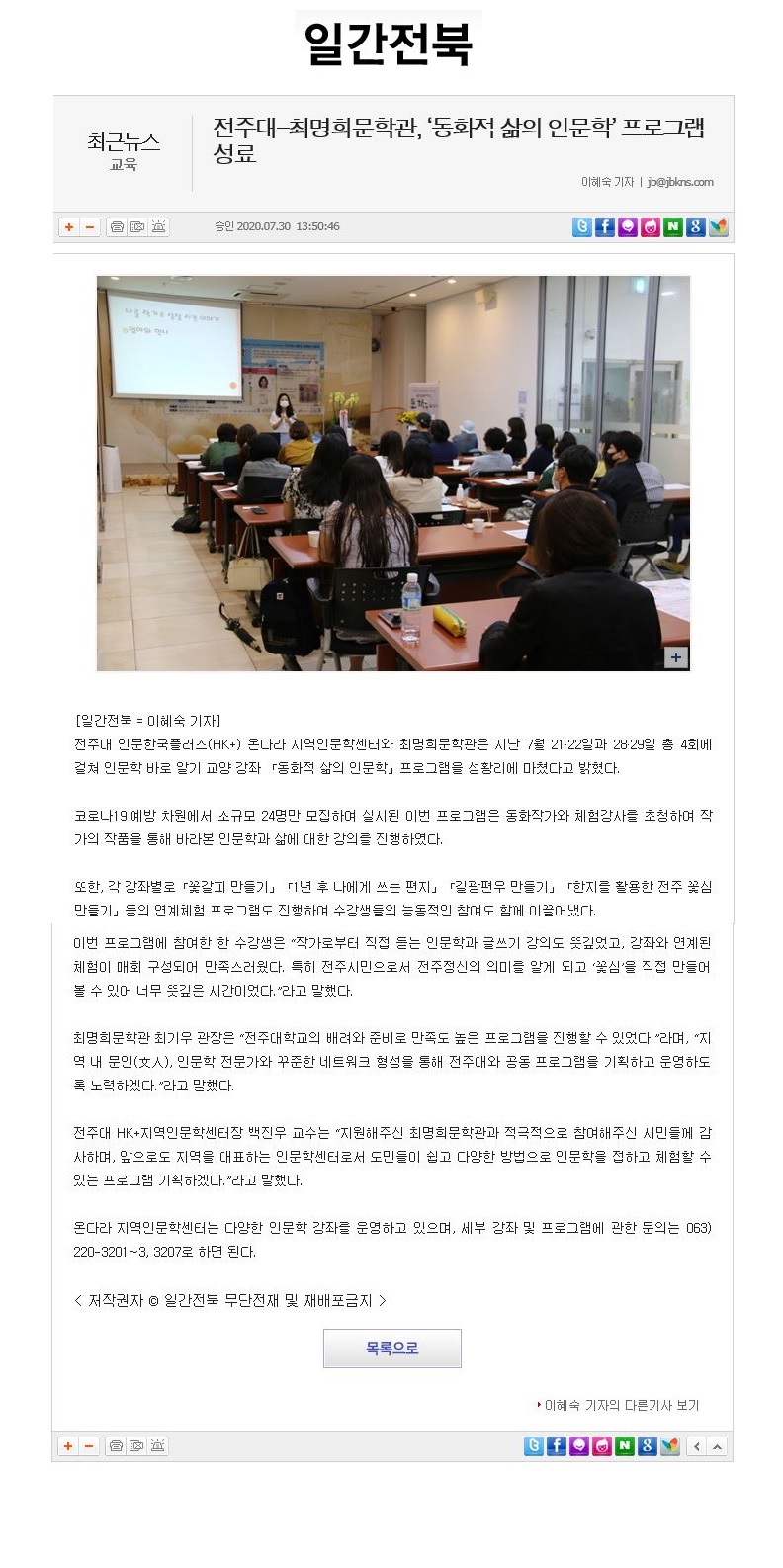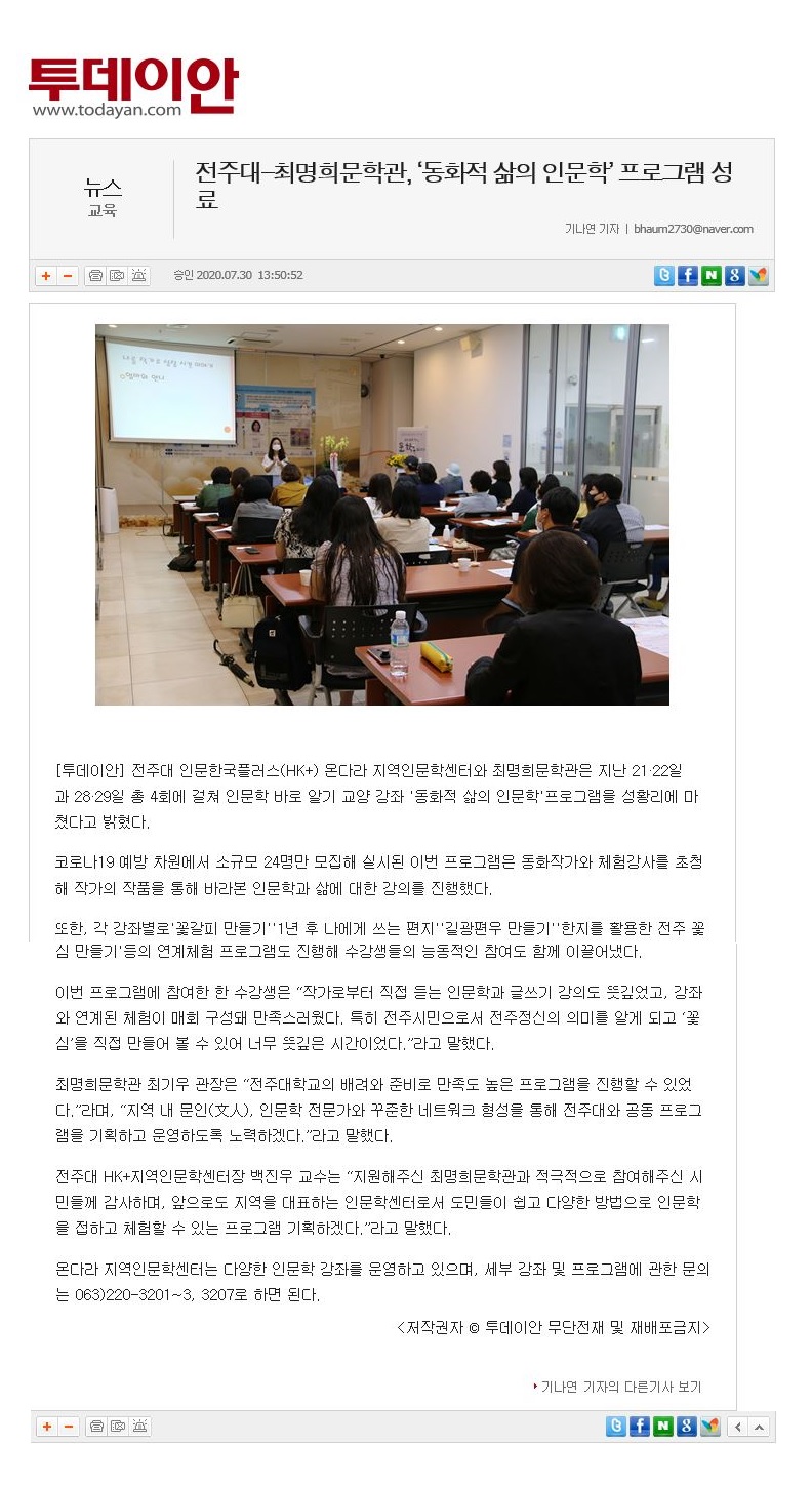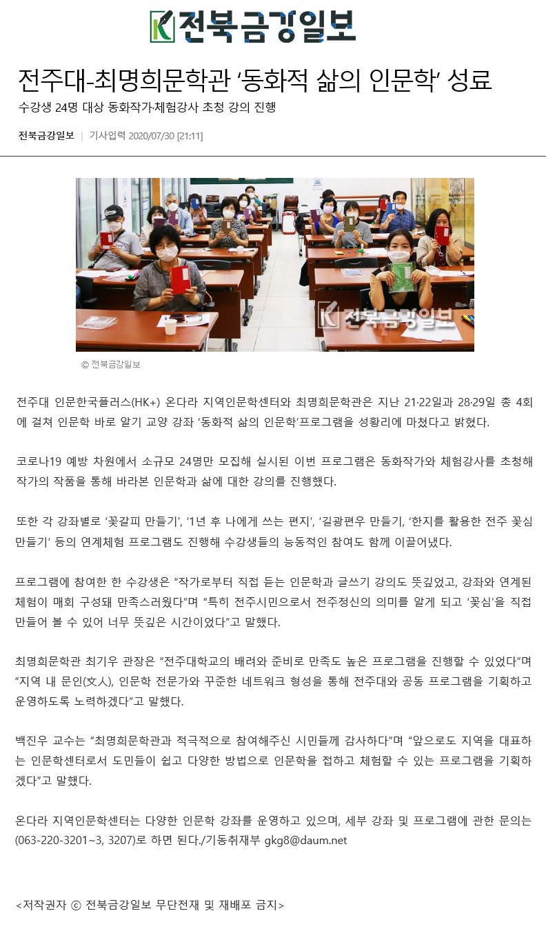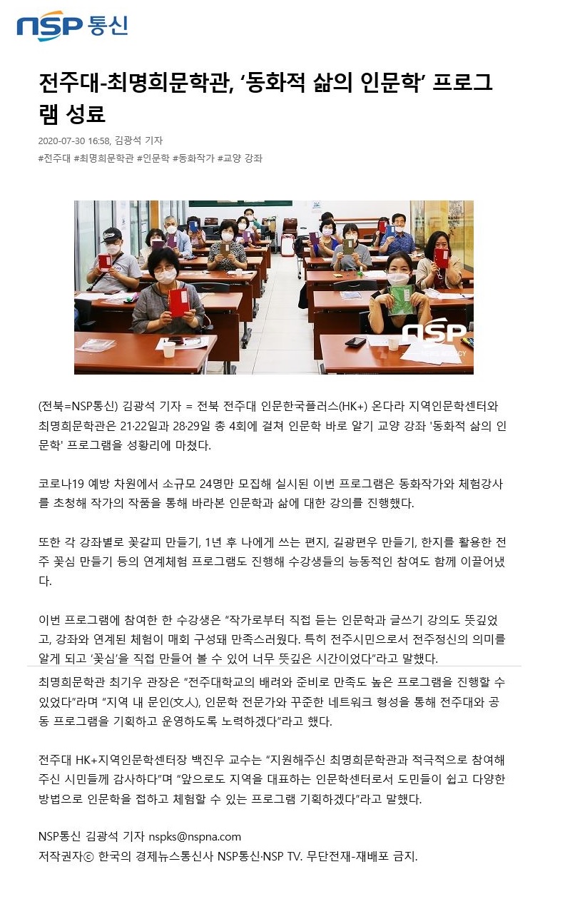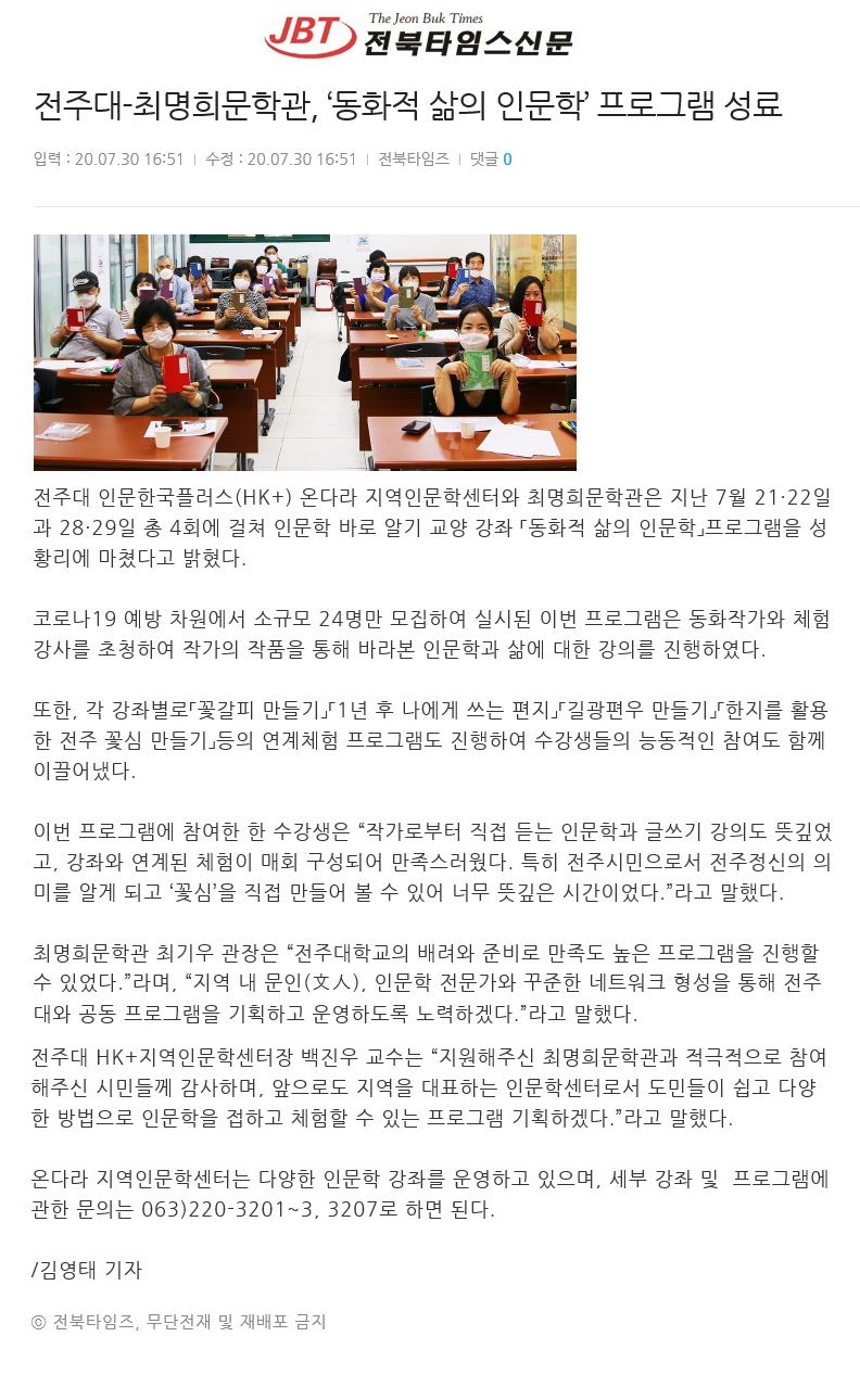 | 287 | 기타 | 전주대-최명희문학관 '동화적 삶의 인문학' 프로그램 성료 | 온다라 지역인문학센터 | 20-08-03 | 222 |