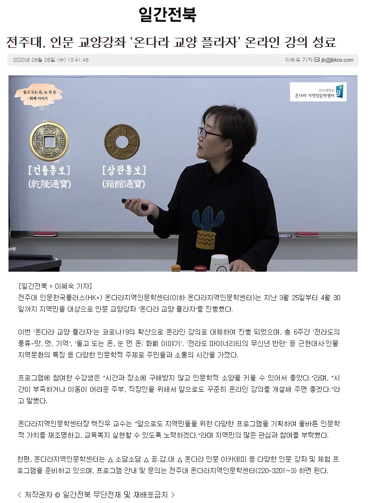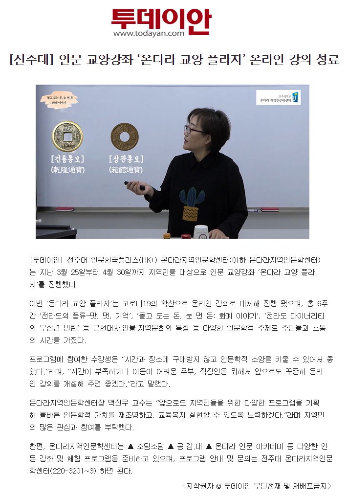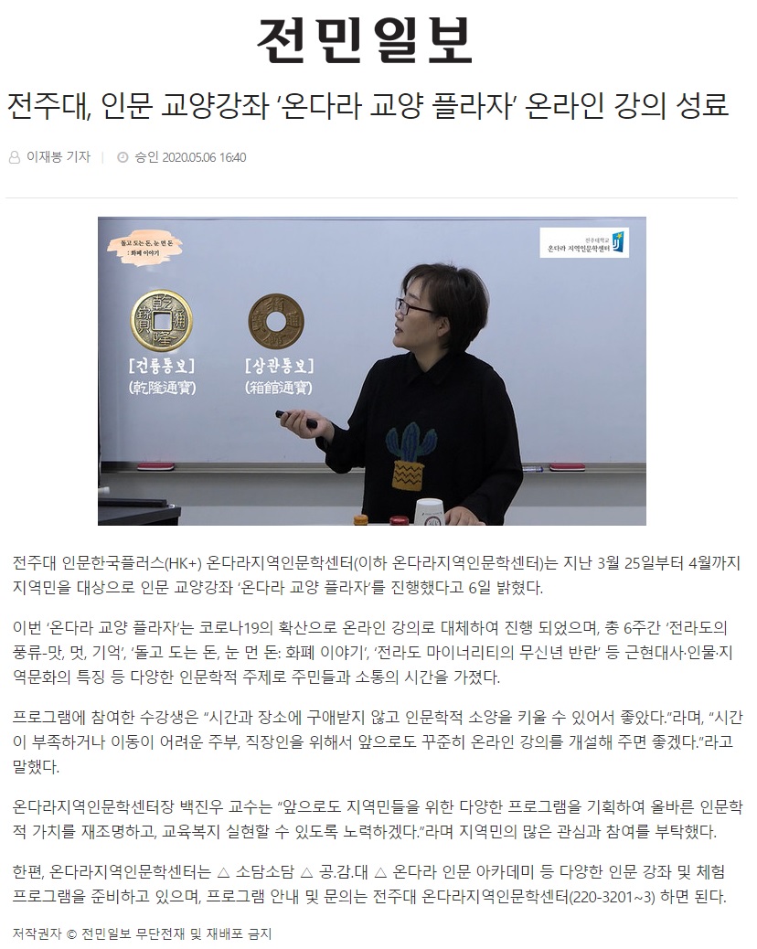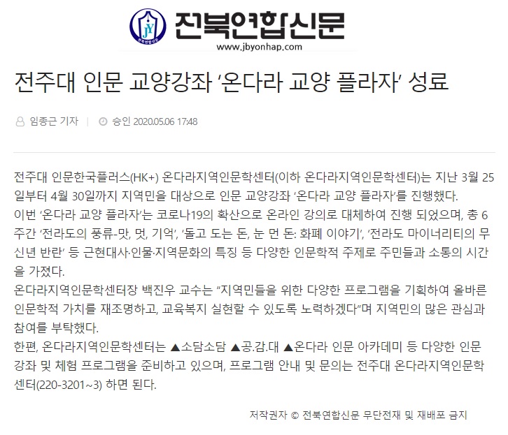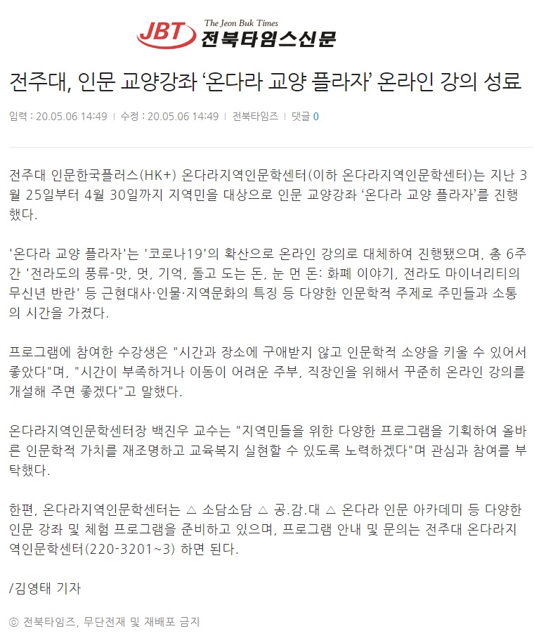 | 260 | 기타 | 전주대, 인문 교양강좌 '온다라 교양 플라자' 온라인 강의 성료 | 온다라 지역인문학센터 | 20-05-12 | 207 |
