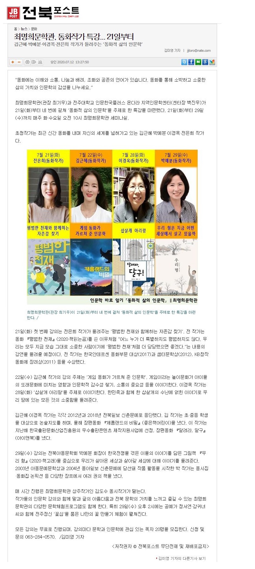 | 268 | 기타 | 최명희문학관, 동화작가 특강... 21일부터 | 온다라 지역인문학센터 | 20-07-27 | 184 |