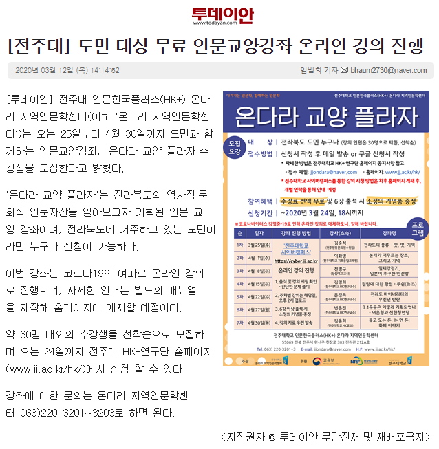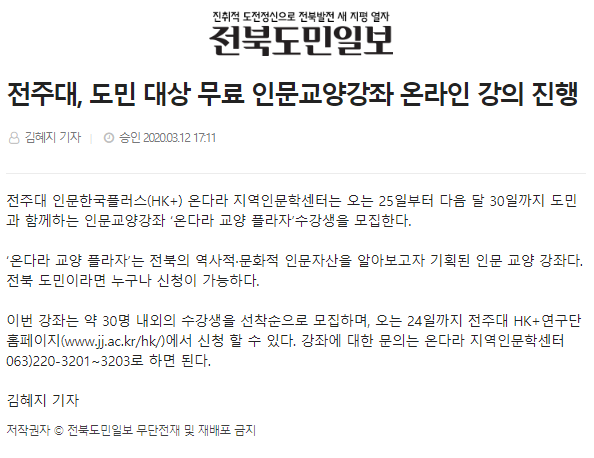 252 기타 도민 대상 무료 인문교양강좌 온라인 강의 진행 온다라 지역인문학센터 20-03-17 255   2020. 03. 12._도민 대상 무료 인문교양강좌 온라인 강의 진행_전북연합신문.png