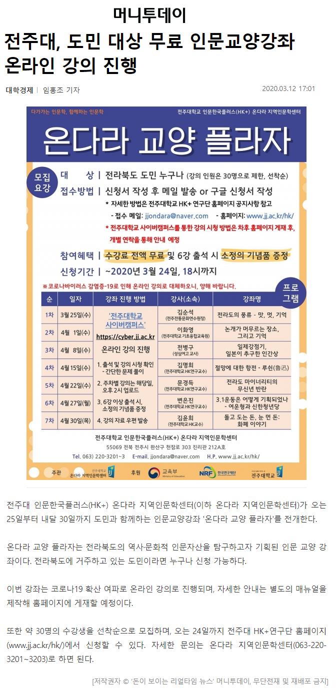 250 기타 전주대, 도민 대상 무료 인문교양강좌 온라인 강의 진행 온다라 지역인문학센터 20-03-17 255   2020. 03. 12._전주대, 도민 대상 무료 인문교양강좌 온라인 강의 진행_머니투데이.png