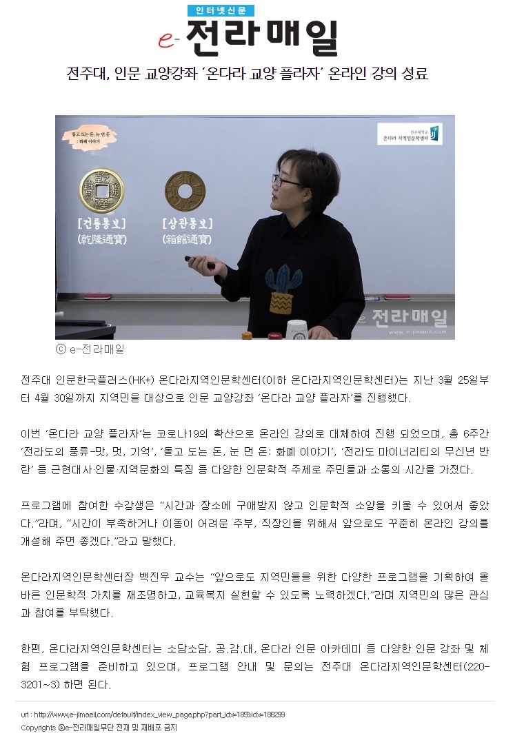 258 기타 전주대, 인문 교양강좌 '온다라 교양 플라자' 온라인 강의 성료 온다라 지역인문학센터 20-05-12 211   200507_전주대, 인문 교양강좌 '온다라 교양 플라자' 온라인 강의 성료_e-전라매일.jpg