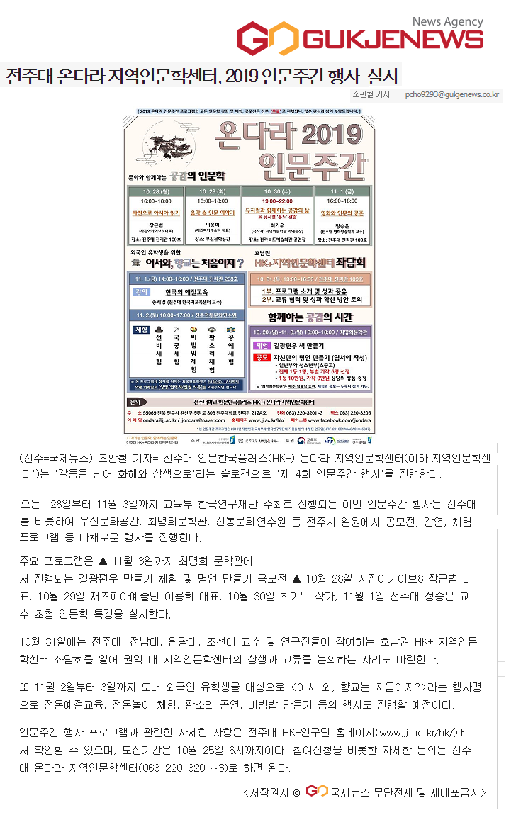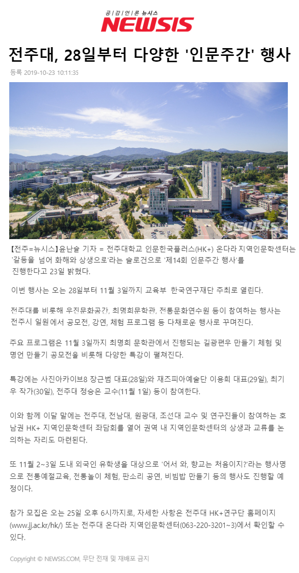 | 210 | 기타 | 전주대 온다라 지역인문학센터, 2019 인문주간 행사 실시 | 온다라 지역인문학센터 | 20-02-03 | 215 |