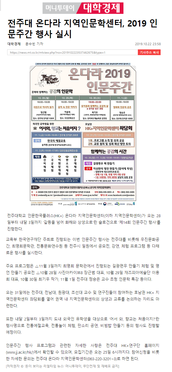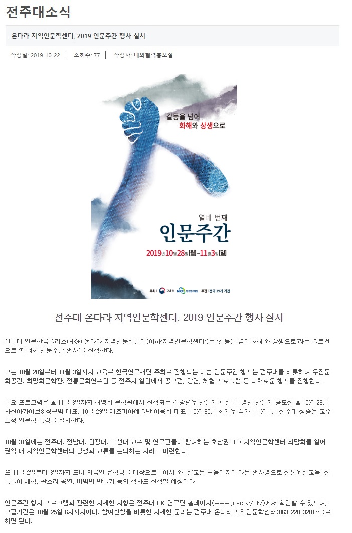 전주대 온다라 지역인문학센터, 2019 인문주간 행사 실시