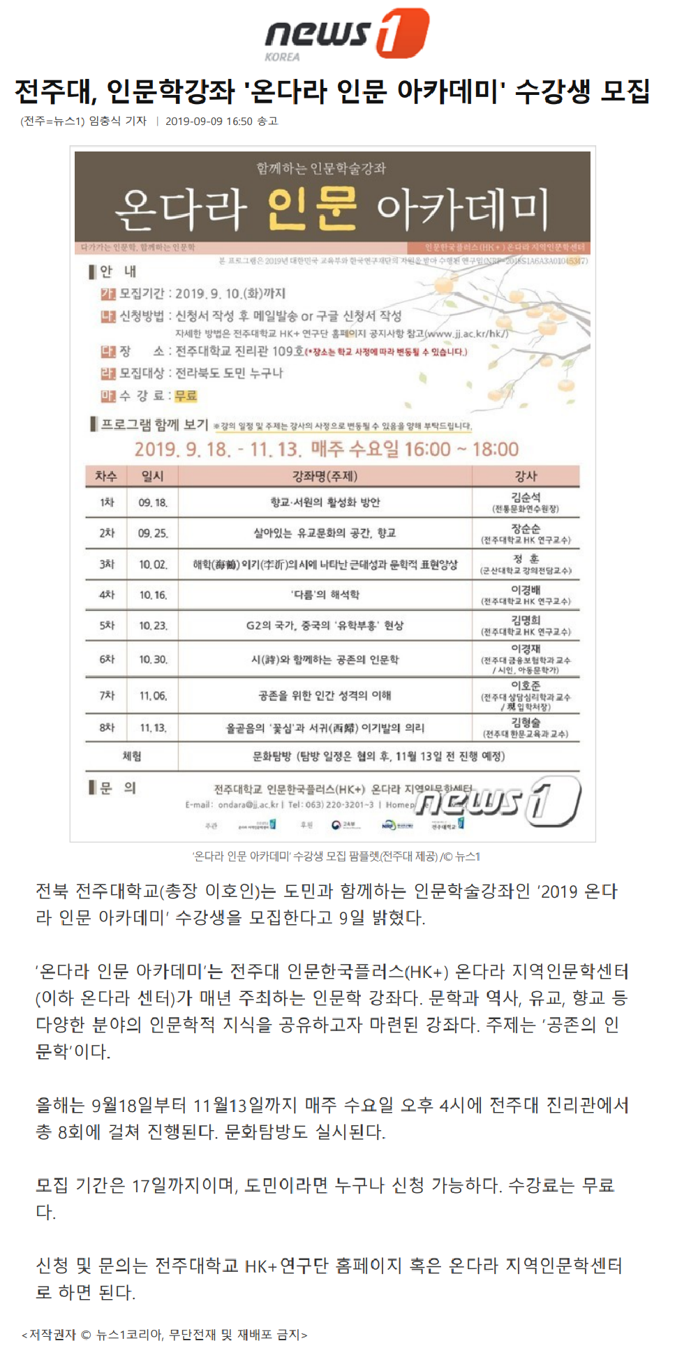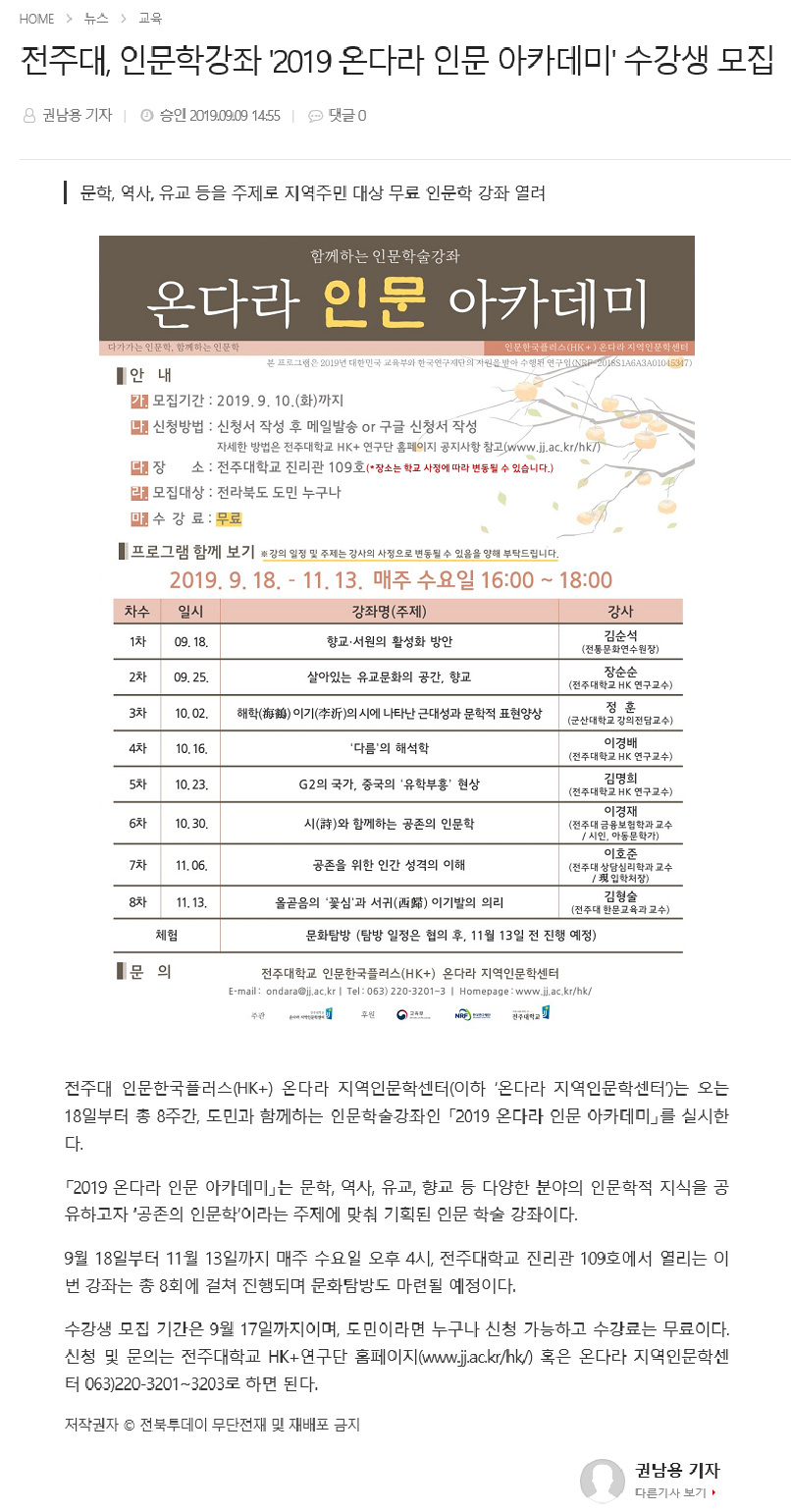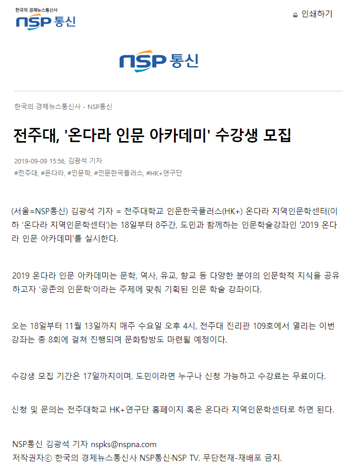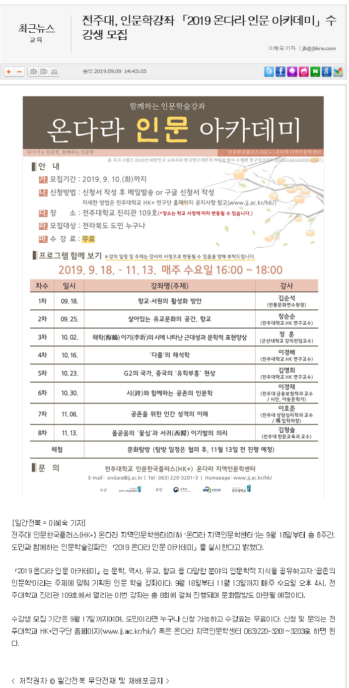 | 193 | 기타 | 전주대, 인문학강좌 '2019 온다라 인문 아카데미' 수강생 모집 | 온다라 지역인문학센터 | 19-09-11 | 274 |