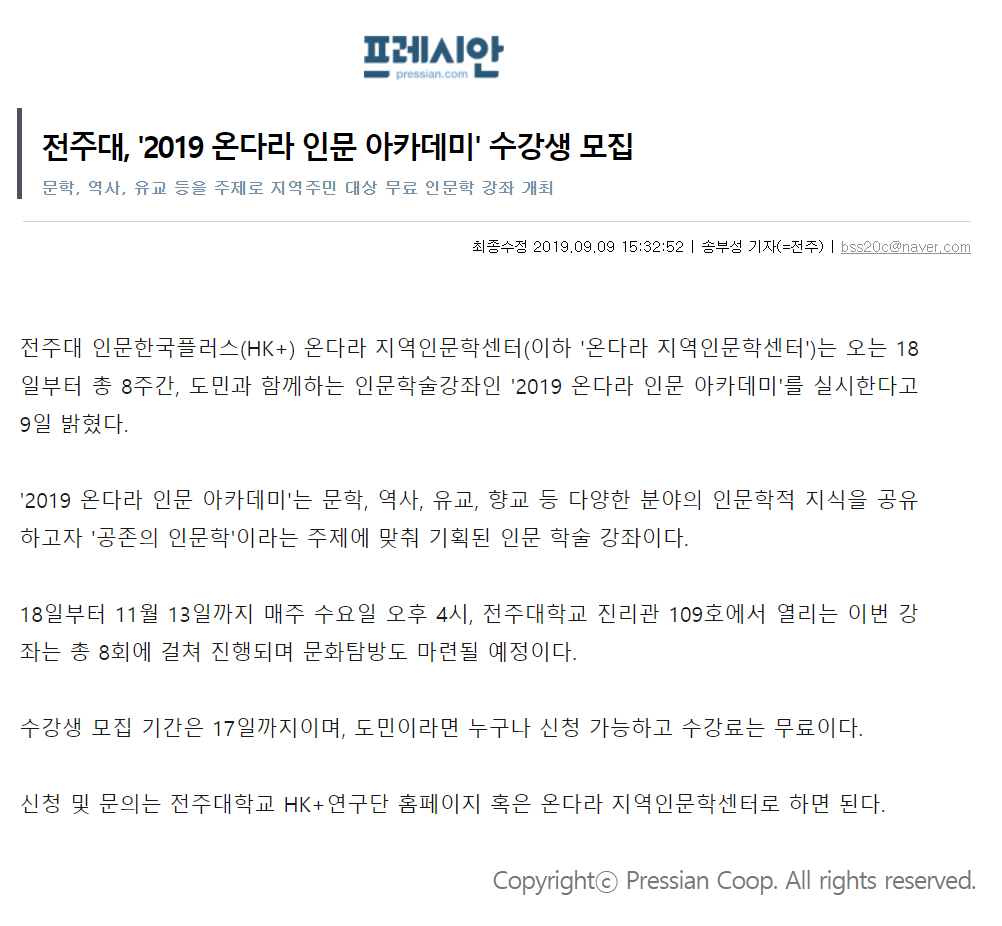 전주대, 인문학강좌 「2019 온다라 인문 아카데미」 수강생 모집