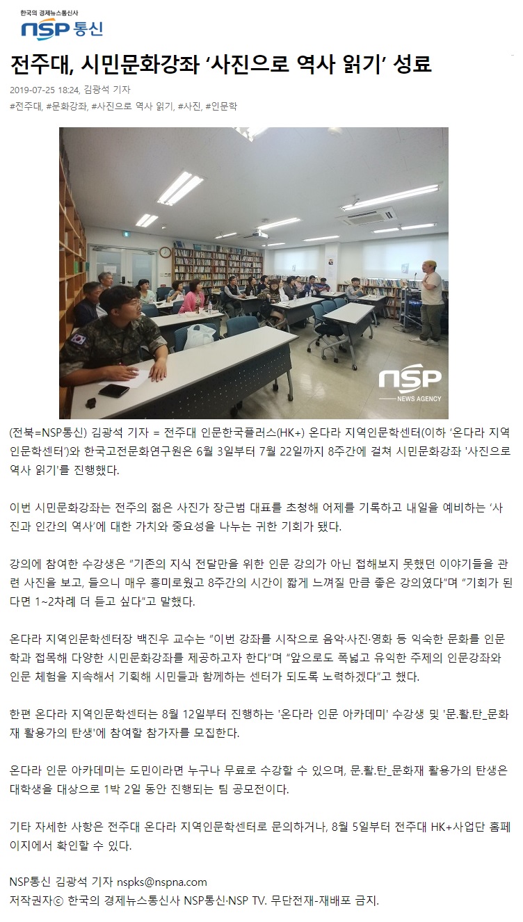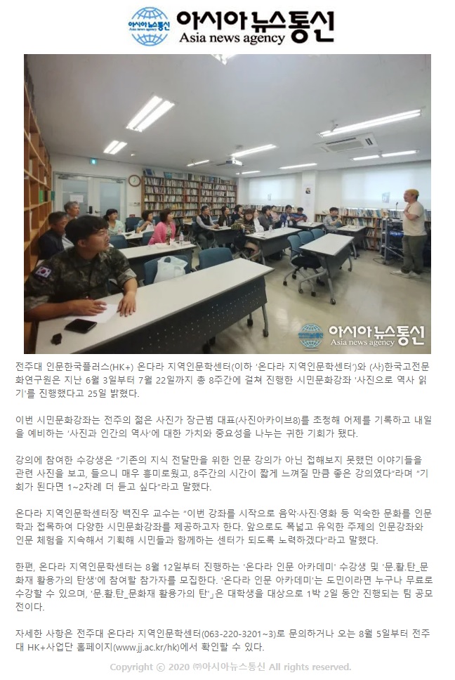 | 169 | 기타 | 전주대, 시민문화강좌 ‘사진으로 역사 읽기’ 성료 | 온다라 지역인문학센터 | 19-08-11 | 243 |